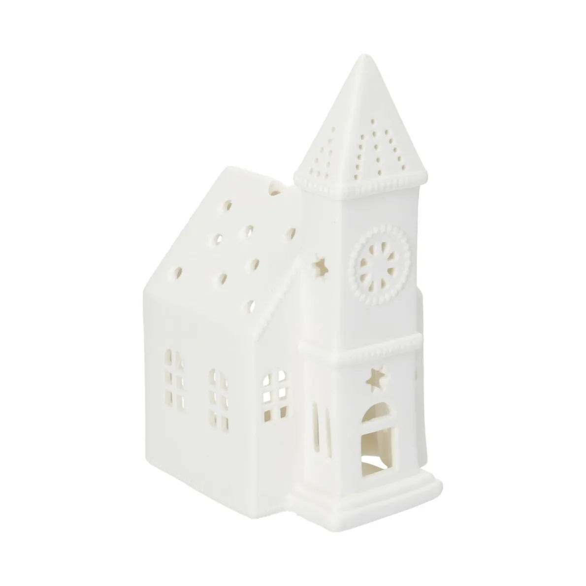 Porseleinen theelichthouder in de vorm van een lief kerkje. Heel sfeervol, het kaarslicht schijnt prachtig door de deur, de ramen en de gaatjes in het dak van de toren.
