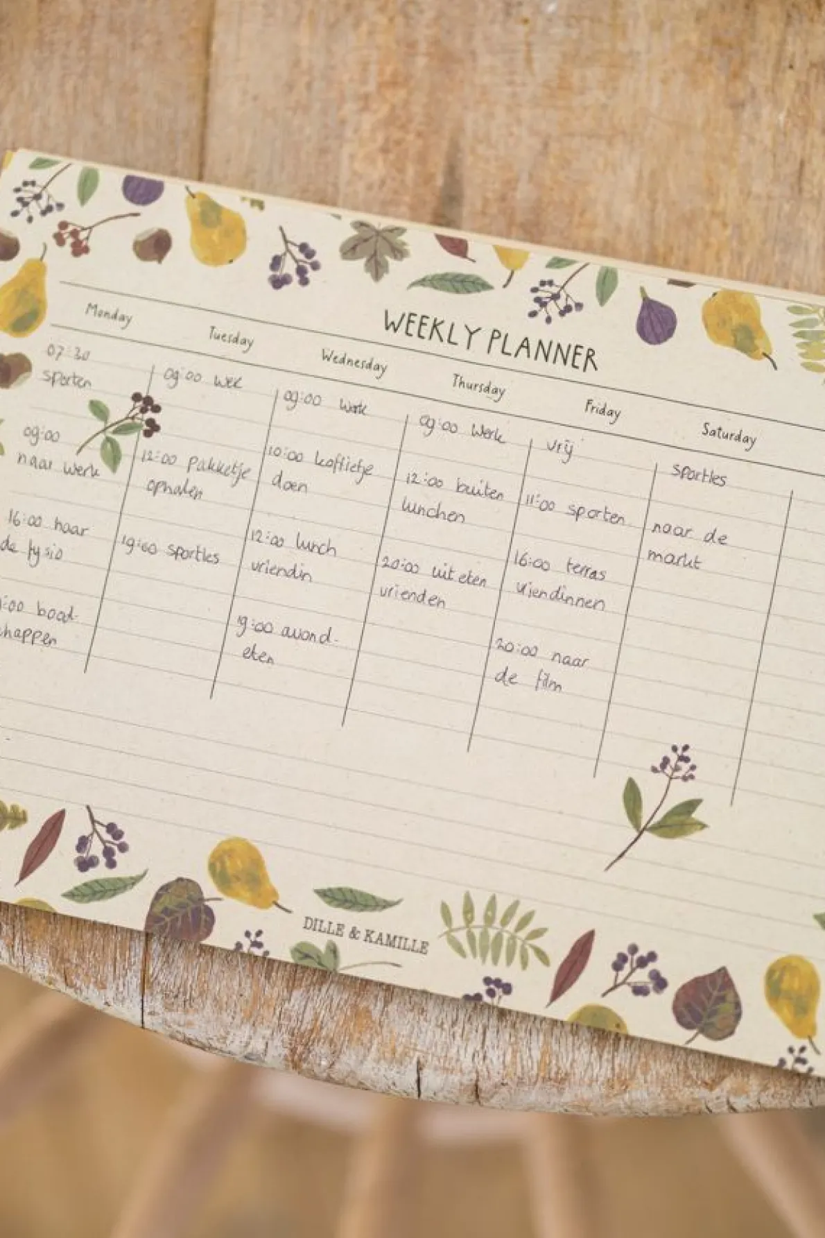 Duizelt het je soms van alle dingen die je moet doen en vooral niet mag vergeten? Noteer alle afspraken, klusjes etc. op deze weekplanner in A4-formaat, dat geeft veel rust in je hoofd. Op elke pagina van de planner staat een week. Het papier voor deze planner is gemaakt van plantaardig oogstafval, er zijn dus geen bomen voor gekapt. Normaal gesproken worden deze resten verbrand, door er papier van te maken, wordt veel CO2-uitstoot bespaard. Het papier is bedrukt met bio-inkt, zonder watergebruik of giftige uitstoot.