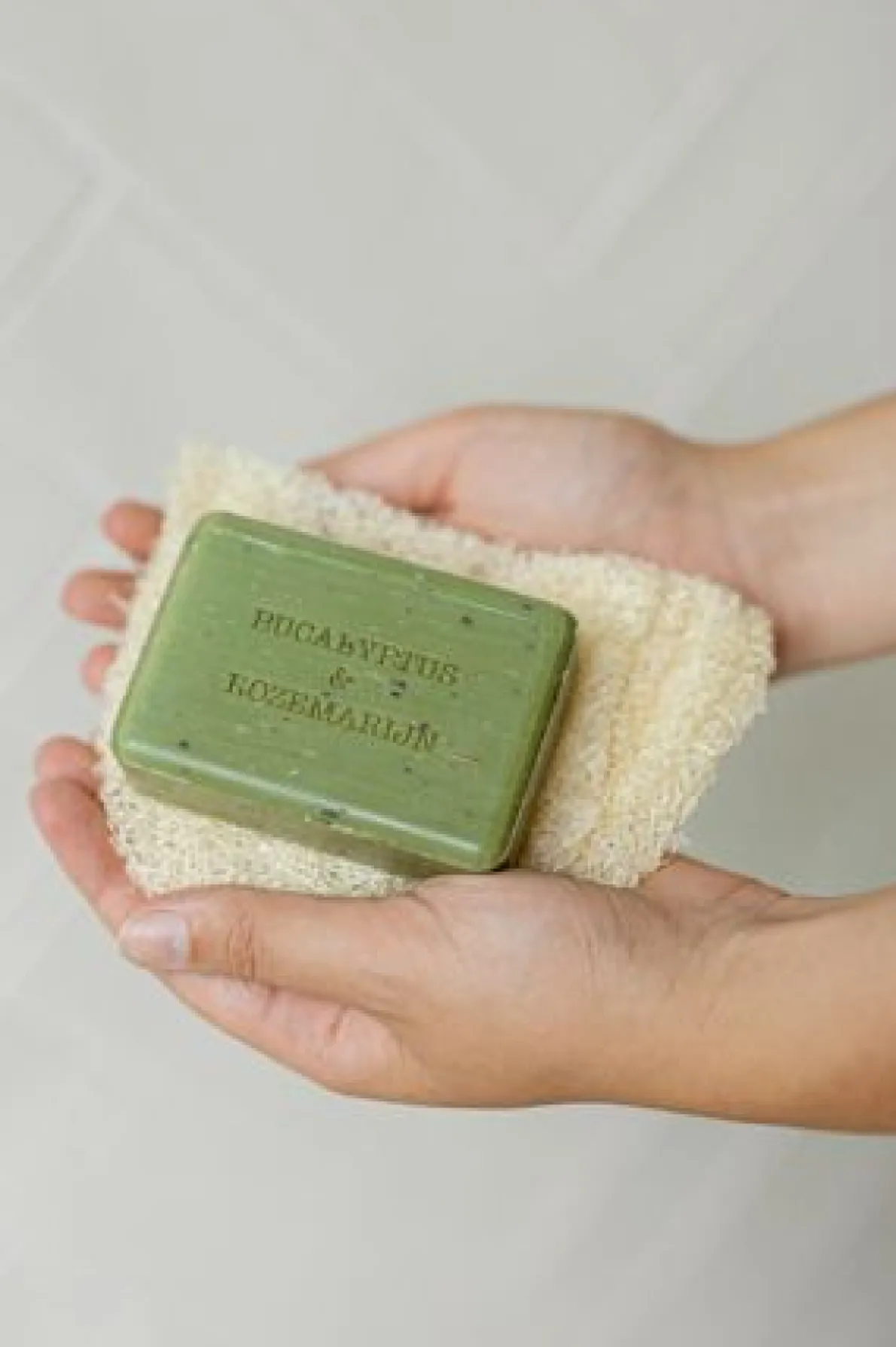 Deze zeep op basis van olijfolie met stukjes rozemarijn en eucalyptus is zo zacht dat je er ook je gezicht mee kunt wassen. Palmolievrij, puur plantaardig en gekleurd met kleipoeder.Tip: Bewaar je favoriete zeepjes tussen de handdoeken in jekast, ruikt heerlijk! Ingredients: Sodium Olivate, Aqua, Parfum, Kaolin, Sodium Chloride, Rosmarinus officinalis, Eucalyptus Globulus Leaf Oil