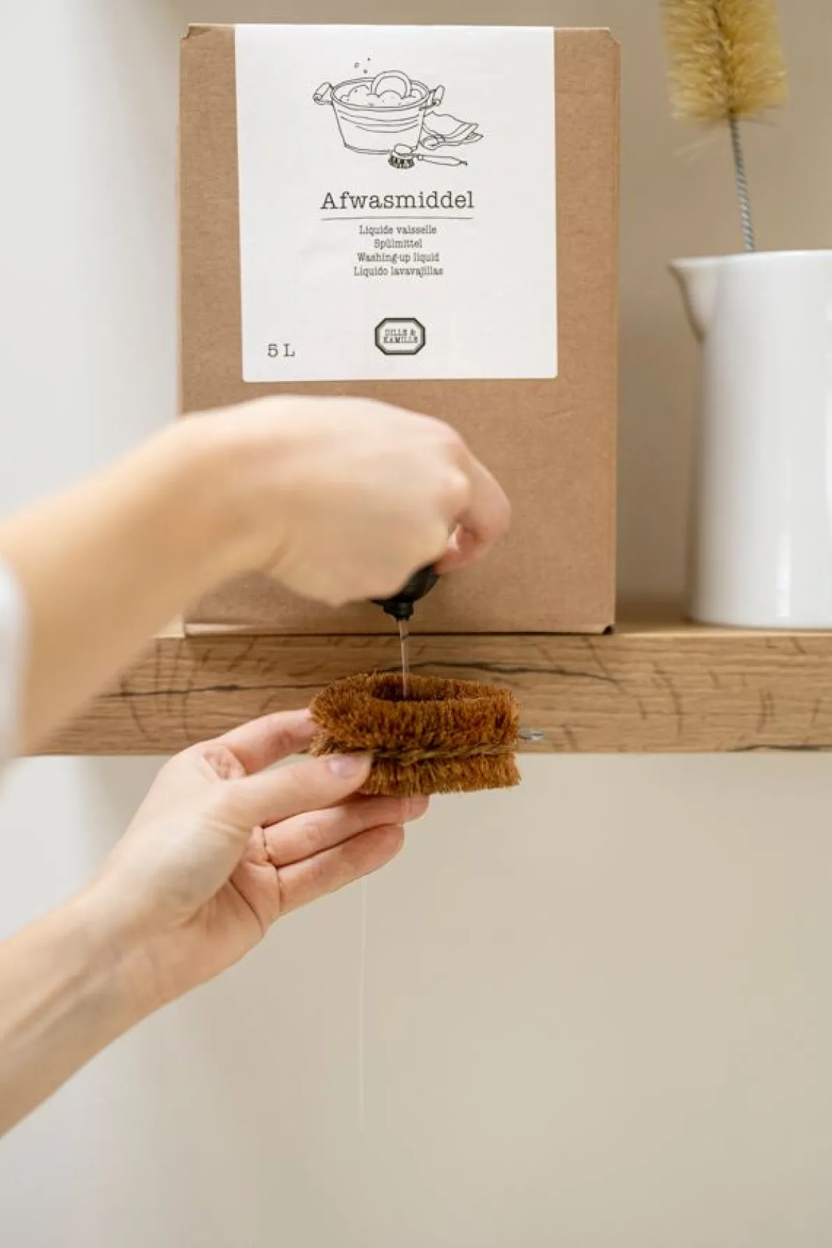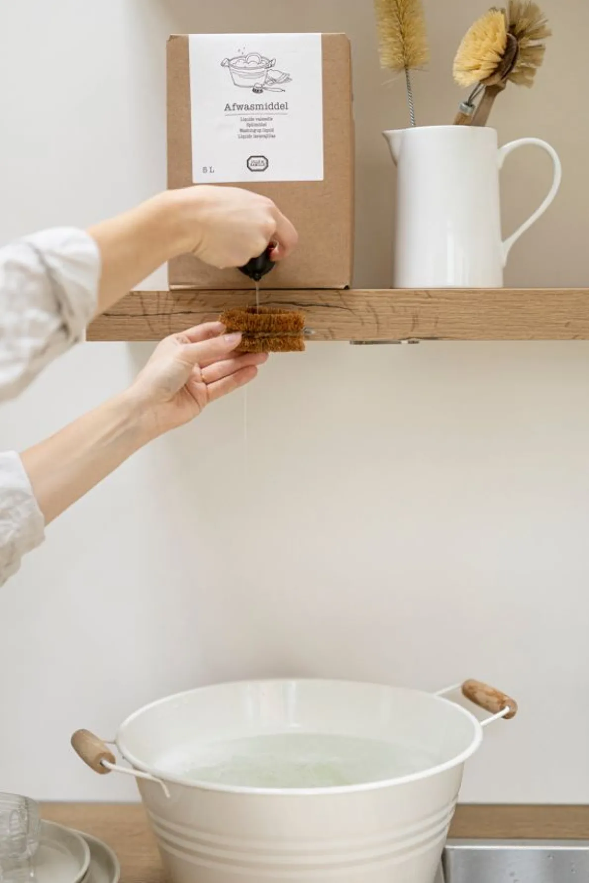 Dit geconcentreerde, natuurlijke afwasmiddel op basis van olijfoliezeep en frisse citroenolie ontvet krachtig, is zacht voor je handen en mild voor het milieu. Met de 5 liter bag in box verpakking, kun je thuis je fles navullen. Of gebruik het handige kraantje om het afwasmiddel direct in de spoelbak te doseren of op een spons/borstel voor onverdund gebruik. Zet de kartonnen doos op een plank of een stevige verhoging. Met een bag in box bespaar je niet alleen geld, je bespaart ook 80% plastic afval. De hele verpakking is recyclebaar. De doos kan worden hergebruikt of bij het oud papier. De zak en het kraantje, mogen bij PMD-afval, of bij restafval als in jouw gemeente plastic niet apart wordt ingezameld. Als de zak bijna leeg is rol je hem van boven naar beneden op om het laatste beetje afwasmiddel richting het kraantje te duwen.