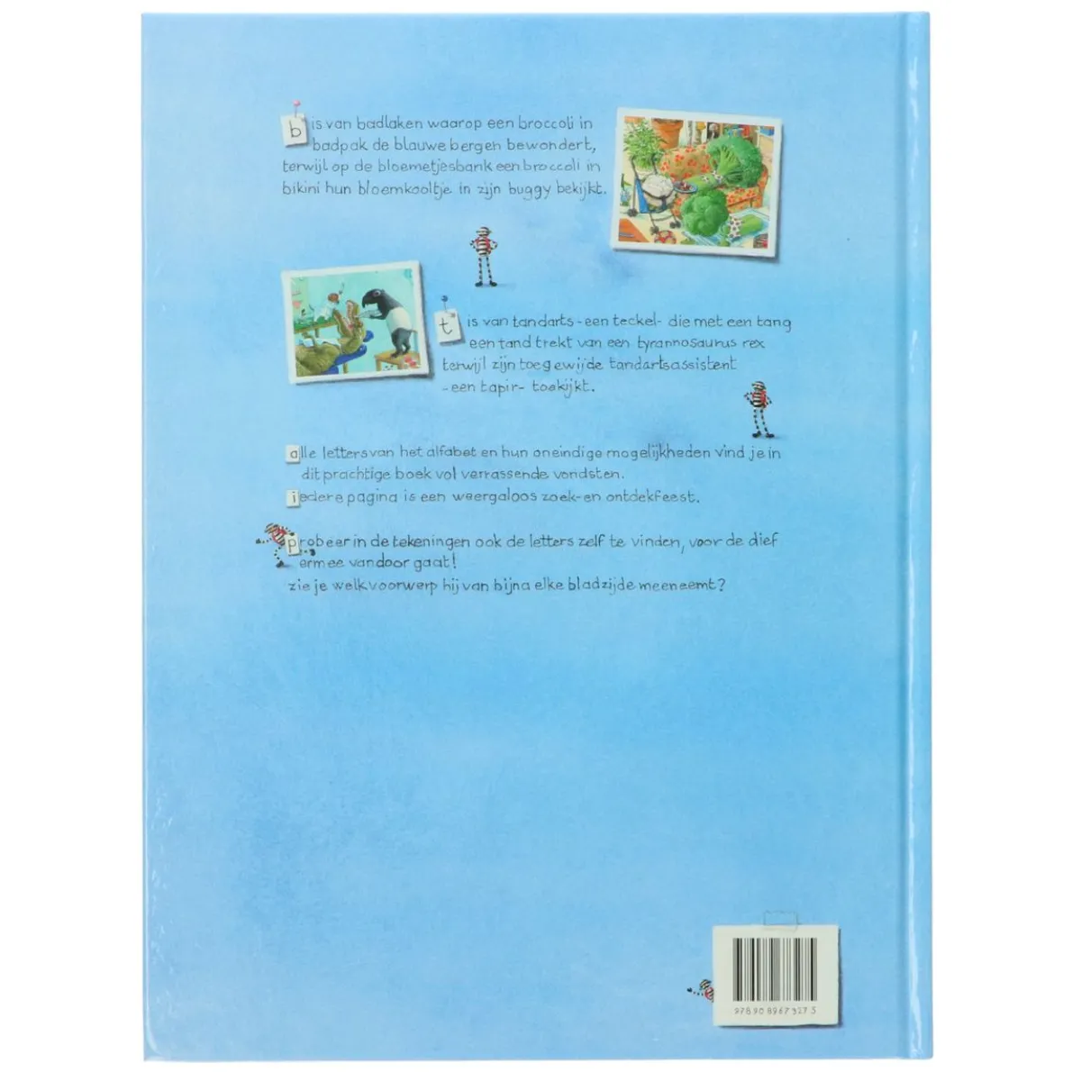 B is van badlaken waarop een broccoli in badpak de blauwe bergen bewondert, terwijl op de bloemetjesbank een broccoli in bikini hun bloemkooltje in zijn buggy bekijkt. T is van tandarts – een teckel – die met een tang een tand trekt van een tyrannosaurus rex terwijl zijn toegewijde tandartsassistent – een tapir – toekijkt. Alle letters van het alfabet en hun oneindige mogelijkheden vind je in dit prachtige boek vol verrassende vondsten. Iedere pagina is een weergaloos zoek- en ontdekfeest. Probeer in de tekeningen ook de letters zelf te vinden, voor de dief ermee vandoor gaat! Zie je welk voorwerp hij van bijna elke bladzijde meeneemt?
