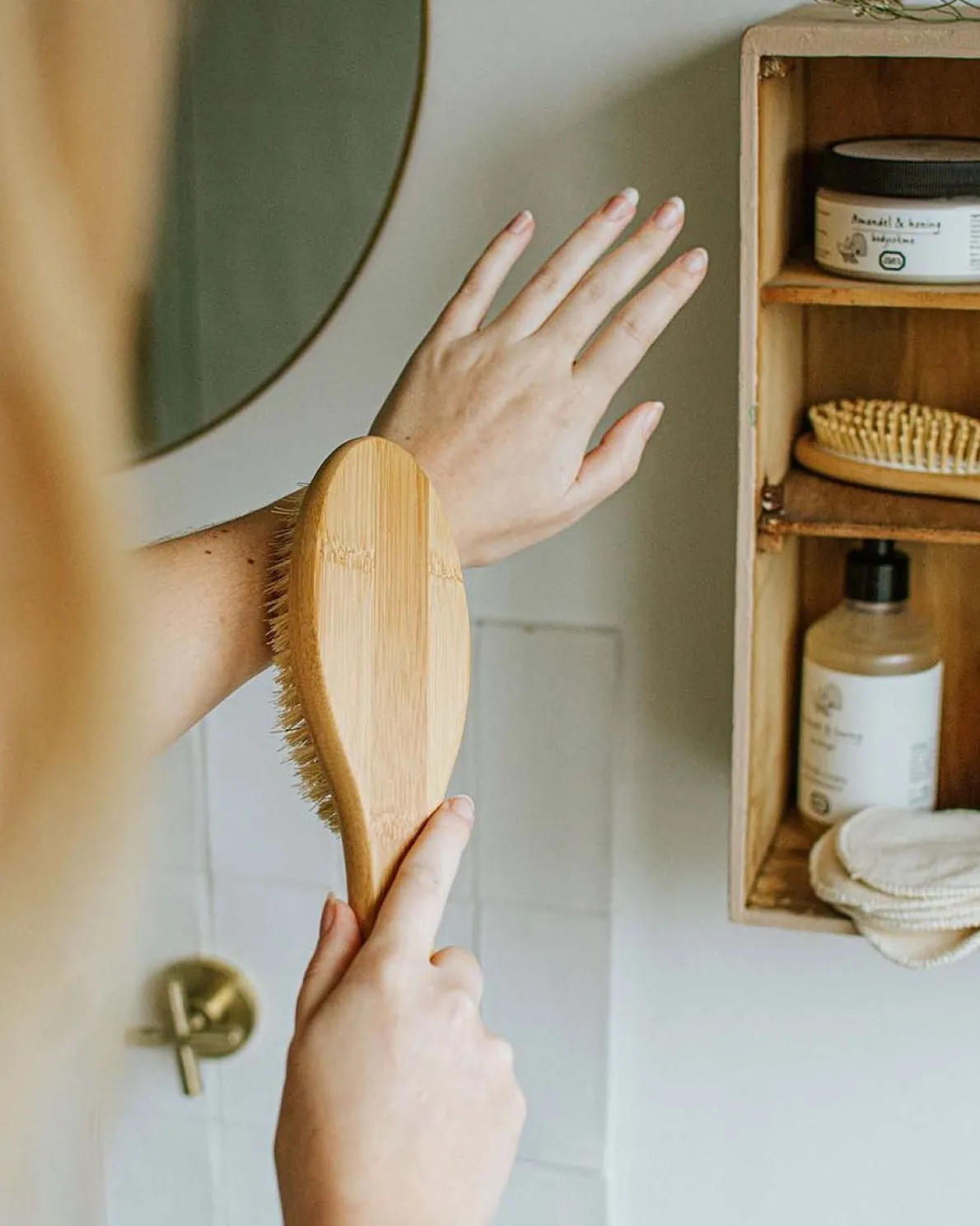 Bamboe badborstel met lange steel en stevige haren, ideaal voor in bad, onder de douche en in de sauna. Gebruik de borstel voor het wassen en tegelijkertijd masseren van je lichaam, of voor zgn. ‘dry brush’. Door je droge rug, armen, benen te borstelen geef je je huid een echte oppepper en hij wordt er heerlijk soepel, glad en zacht van. Met deze borstel geef je je badkamer een stijlvolle spa-sfeer.