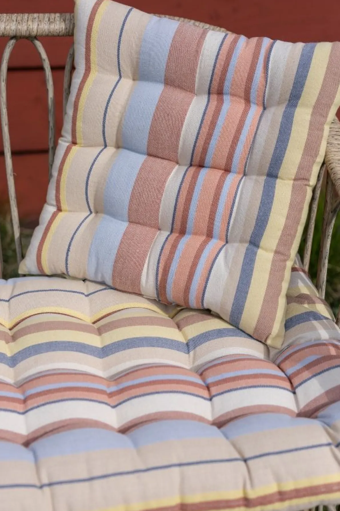 Maak van je tuinbankje een gezellige en comfortabele plek met dit langwerpige kussen met gekleurde strepen. Of ga lekker op het kussen op de grond of in het gras zitten. Leuk om te combineren met onze tuinkussens in hetzelfde dessin.