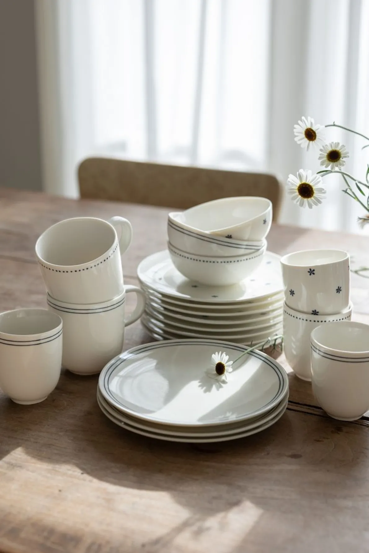 Met deze fijne beker, bedrukt met blauwe stipjes, geniet je nog meer van je kop koffie, thee of (chocolade)melk. De beker is onderdeel van een serviesserie bestaande uit deze beker, ontbijtbordje, kommetje en theemok. Verkrijgbaar in drie verschillende dessins. Een mooi organisch servies van porselein met een licht onregelmatige afwerking. De donkerblauwe stipjes zijn een decal. Dit is een speciale folie dat op hoge temperatuur in de oven op het servies wordt gebrand. Het servies kan daardoor in de vaatwasser. De verschillende printjes – ontworpen door Dille & Kamille – passen leuk bij elkaar, maar zijn ook een mooie aanvulling op ons organisch gevormde witte servies.