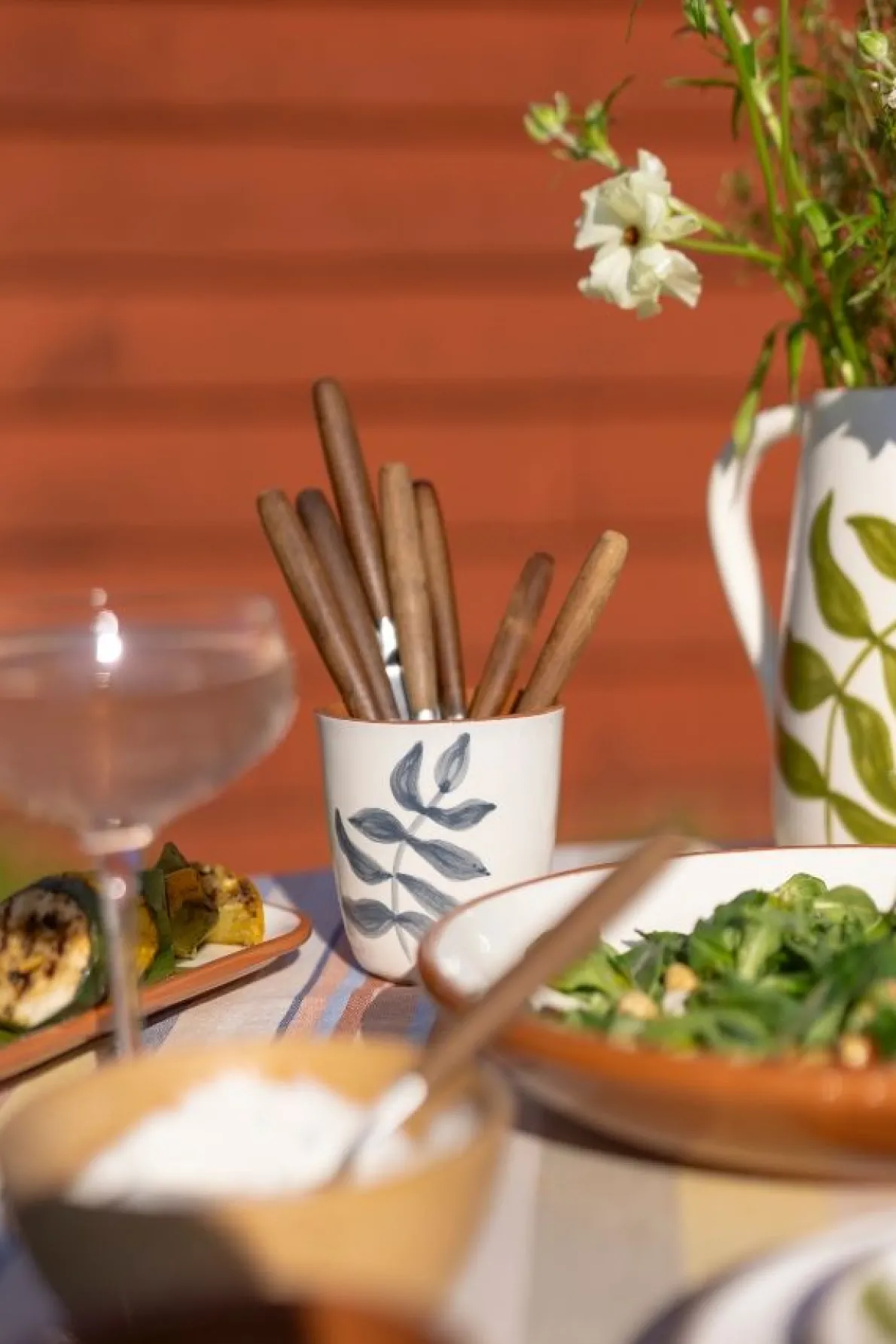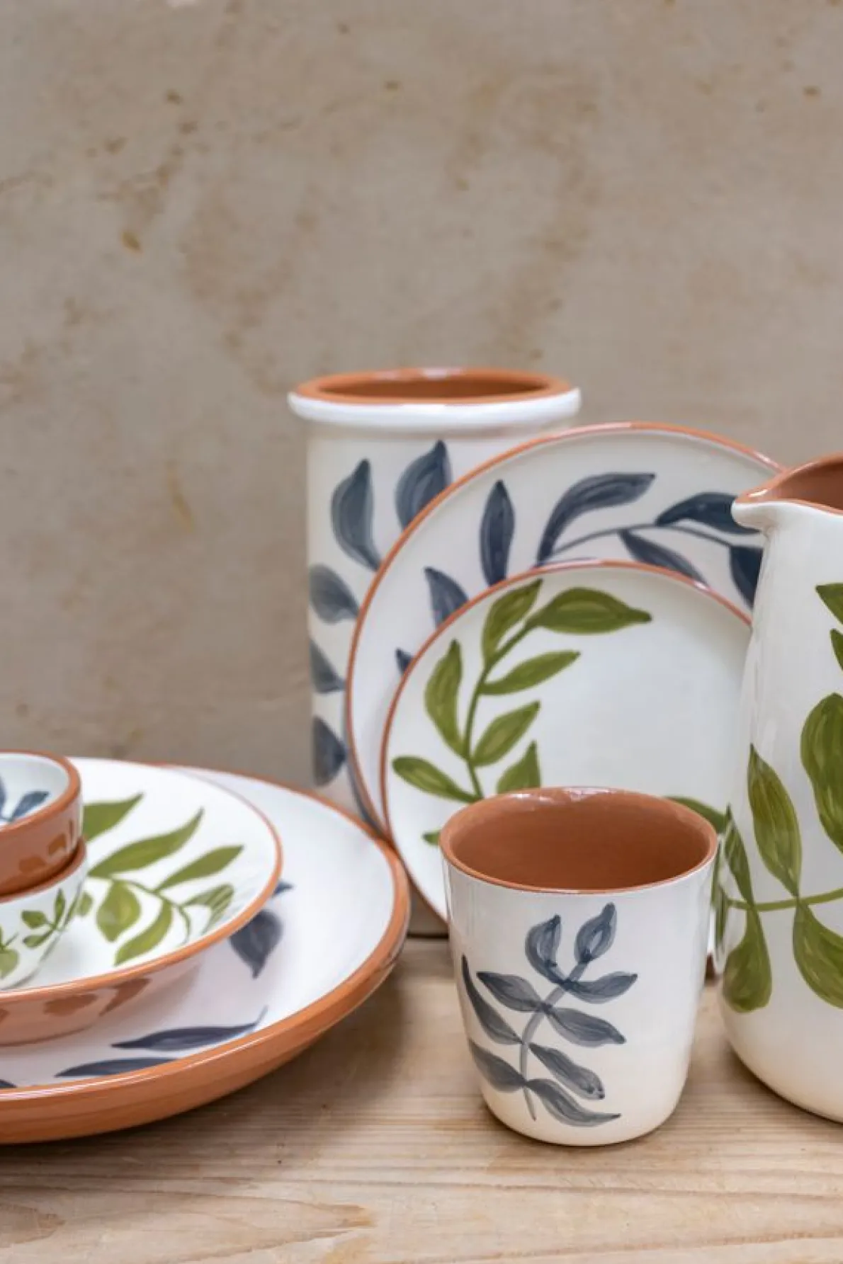 Deze tas maakt deel uit van een serviesreeks. Een zomers servies uit geglazuurd terracotta, gemaakt en met de hand beschilderd in Portugal. Met dit servies breng je een warme, zuiderse sfeer op tafel. De tas heeft een crèmekleurige geglazuurde buitenkant en een terracottakleurige binnenkant.Heel mooi in combinatie met de andere stukken uit dit servies, en leuk om te gebruiken samen met bijvoorbeeld onze houten kommetjes en serveerplanken. Het motief is een eigen ontwerp van Dille & Kamille.