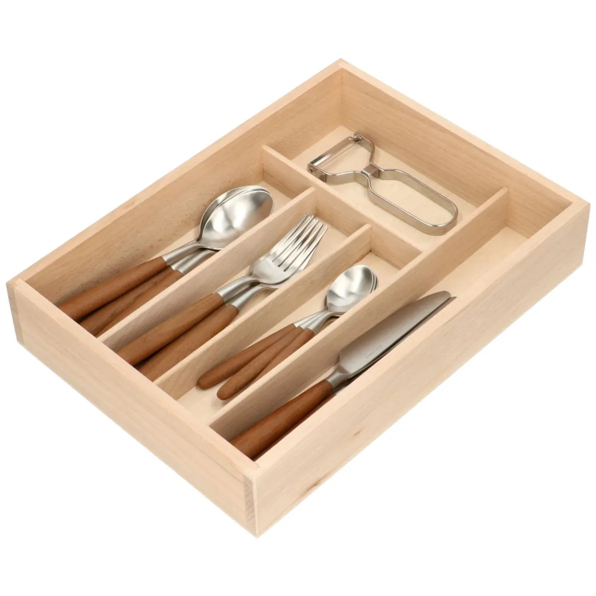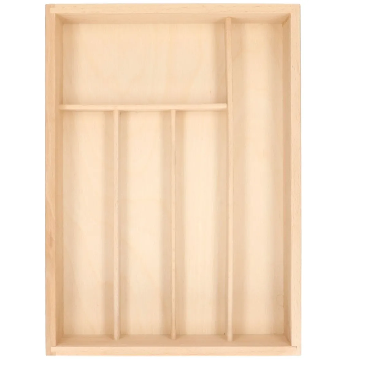 Degelijke bestekbak met vijf ruime vakken. Onbewerkt beukenhout, mooi afgewerkt met afgeronde bovenzijde van de zijkanten en tussenschotjes. Afmetingen 34 x 24,5 x 5,5 cm.