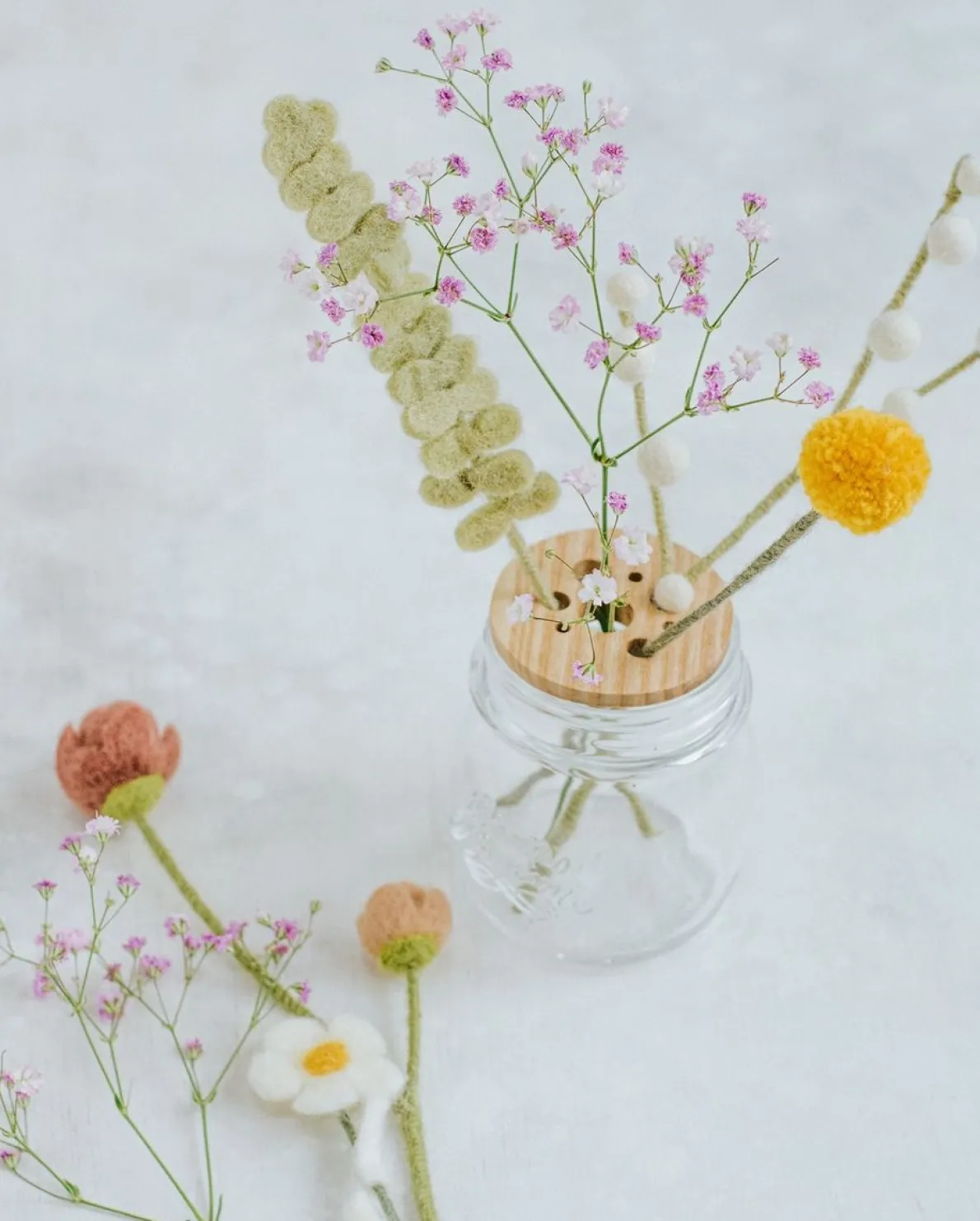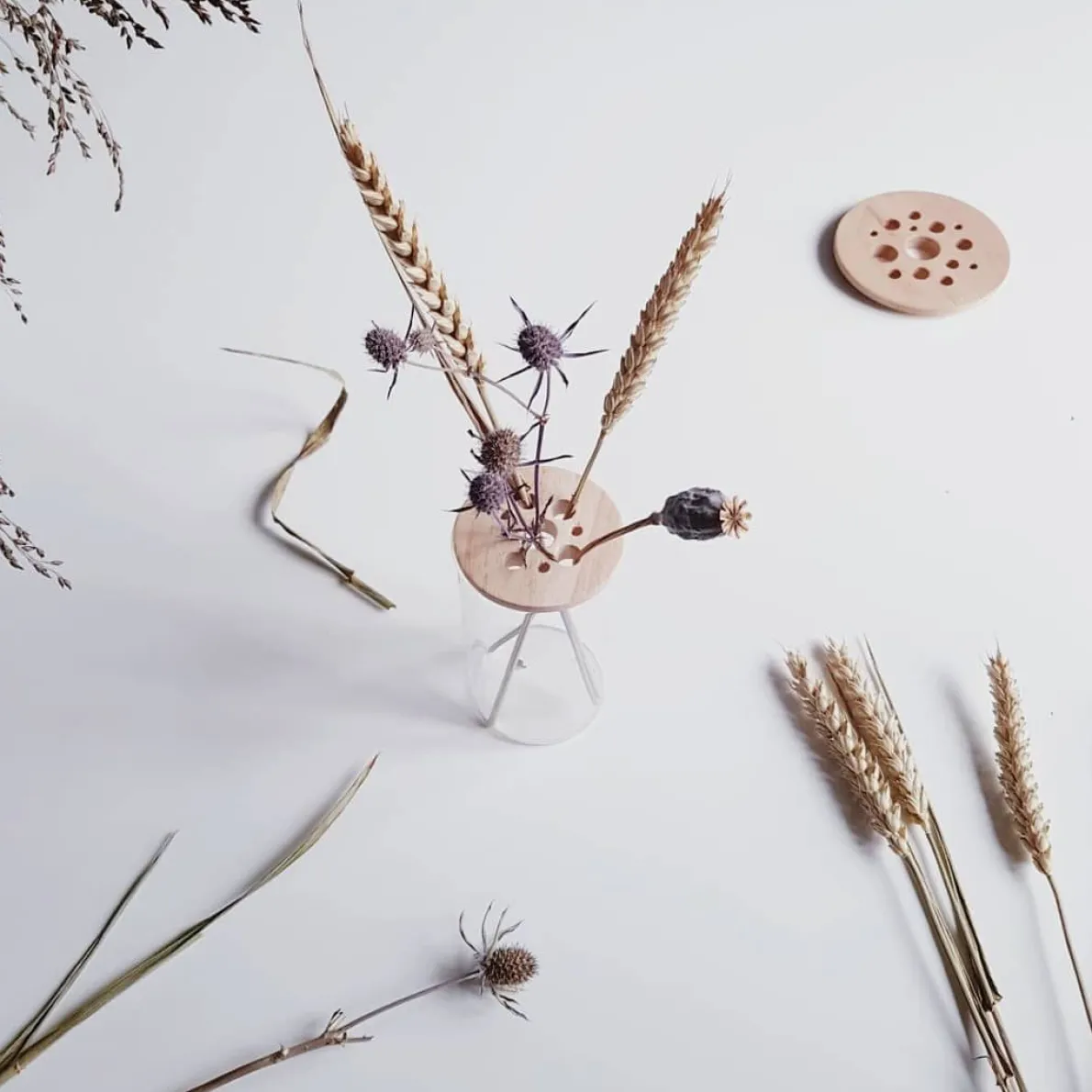 Dit houten schijfje met gaatjes is een handig hulpje om een mooi boeket (droog)bloemen te maken. Leg de bloemverdeler op de opening van een vaas of glazen pot en steek de bloemstelen door de gaatjes. De dikke stelen gaan in de grote gaatjes, dunnere stelen in de kleine. Zo krijg je een mooie, gelijkmatige verdeling. Zelfs met een paar bloemen maak je al een prachtige compositie.