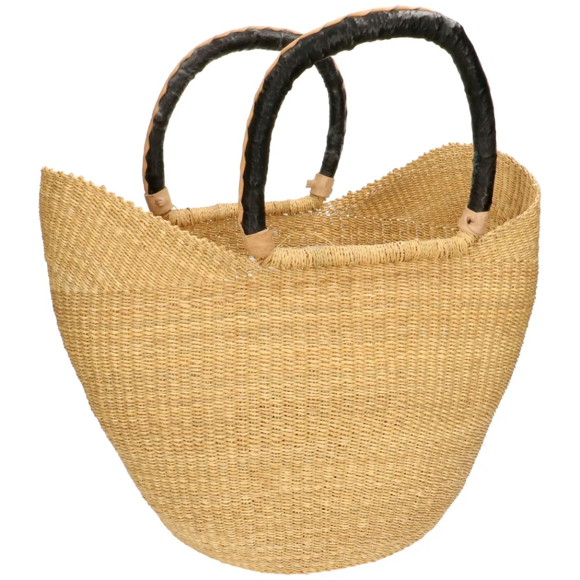 Handgevlochten, traditionele mand uit Bolgatanga (Ghana) van savannegras met lederen handvat. Bolgamanden worden gevlochten door vrouwen die hiermee hun eigen inkomen verdienen. De boodschappenmand is ook heel geschikt om bv. speelgoed in op te bergen.