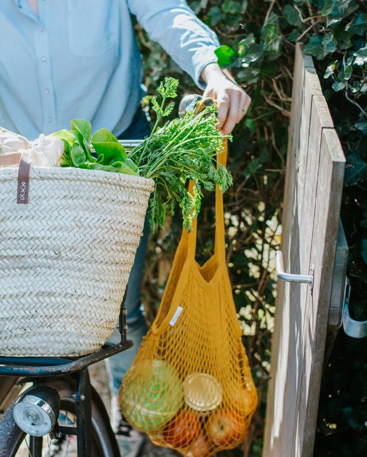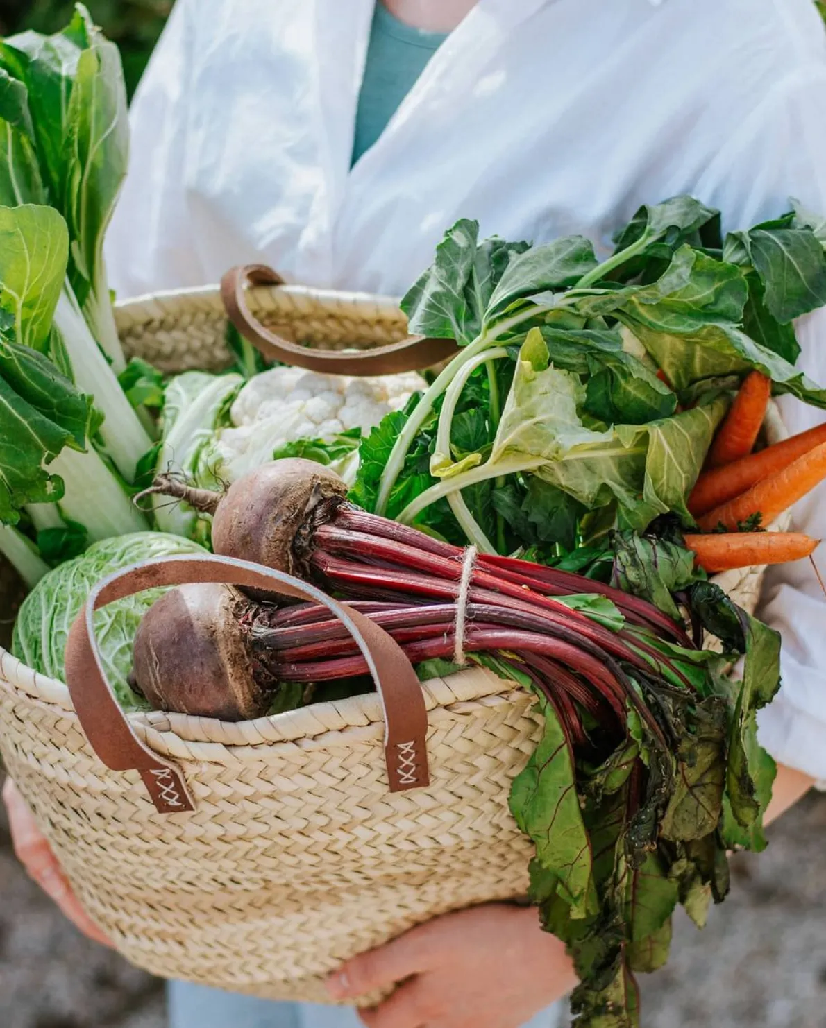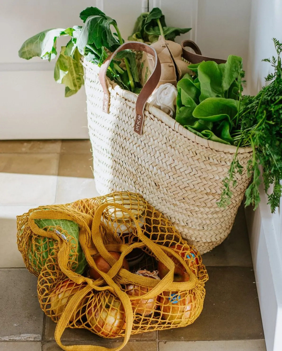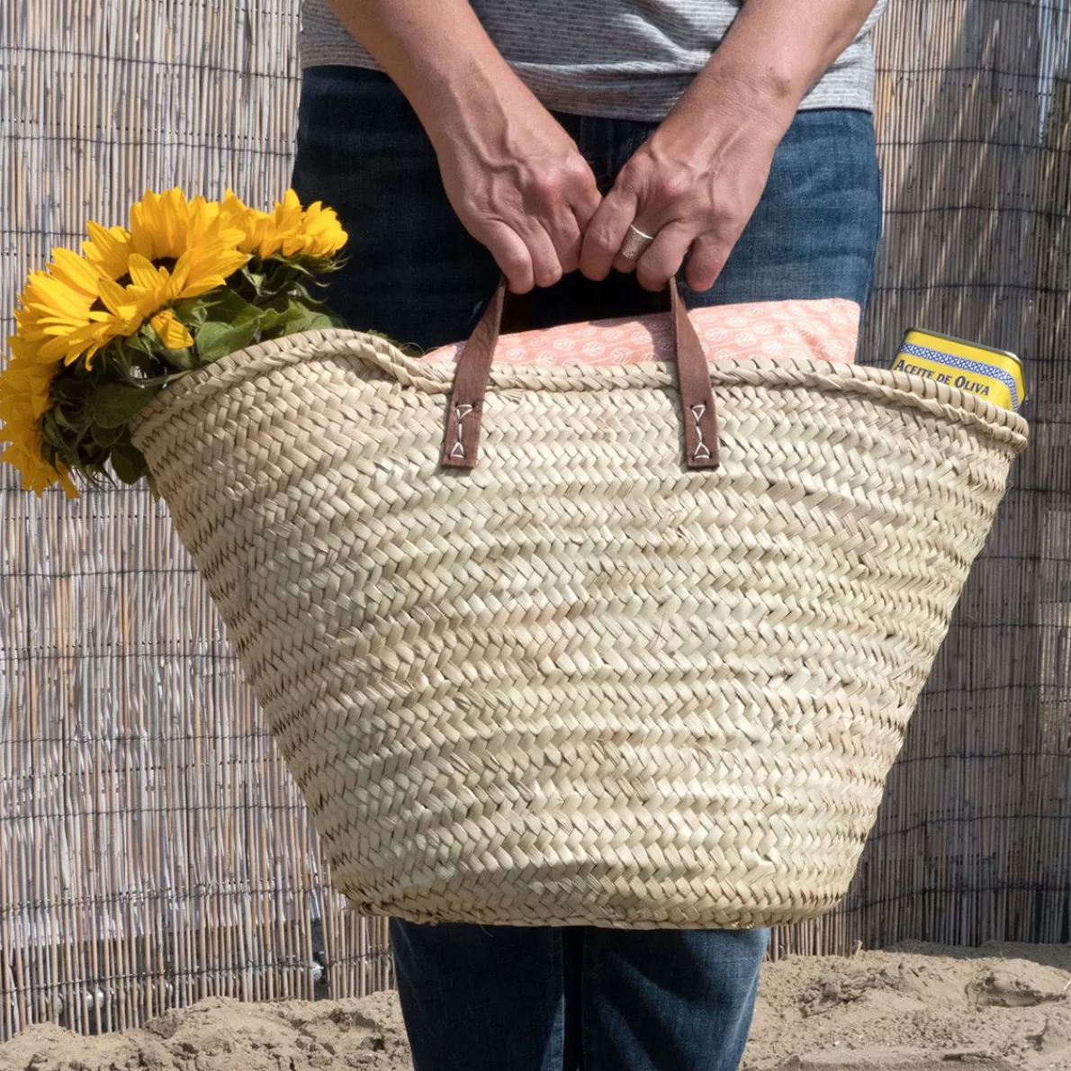 Handgevlochten boodschappentas van palmblad, gemaakt in Marokko. Met geitenleren hengsel. Afmetingen ca. hoogte 30 x breedte 20 cm (exclusief hengsel). Draaglengte hengsel ca.15 cm. Omdat dit een handgemaakt ambachtelijk product is, kunnen de afmetingen van tas tot tas enigszins verschillen.