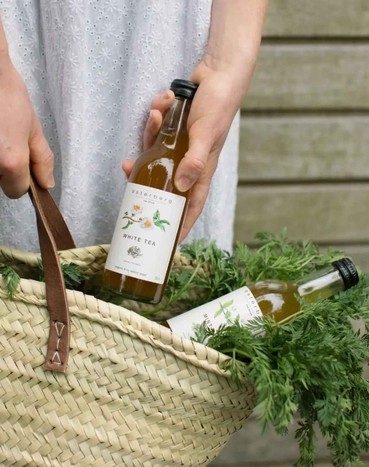 Handgevlochten boodschappentas van palmblad, gemaakt in Marokko. Met geitenleren hengsel.