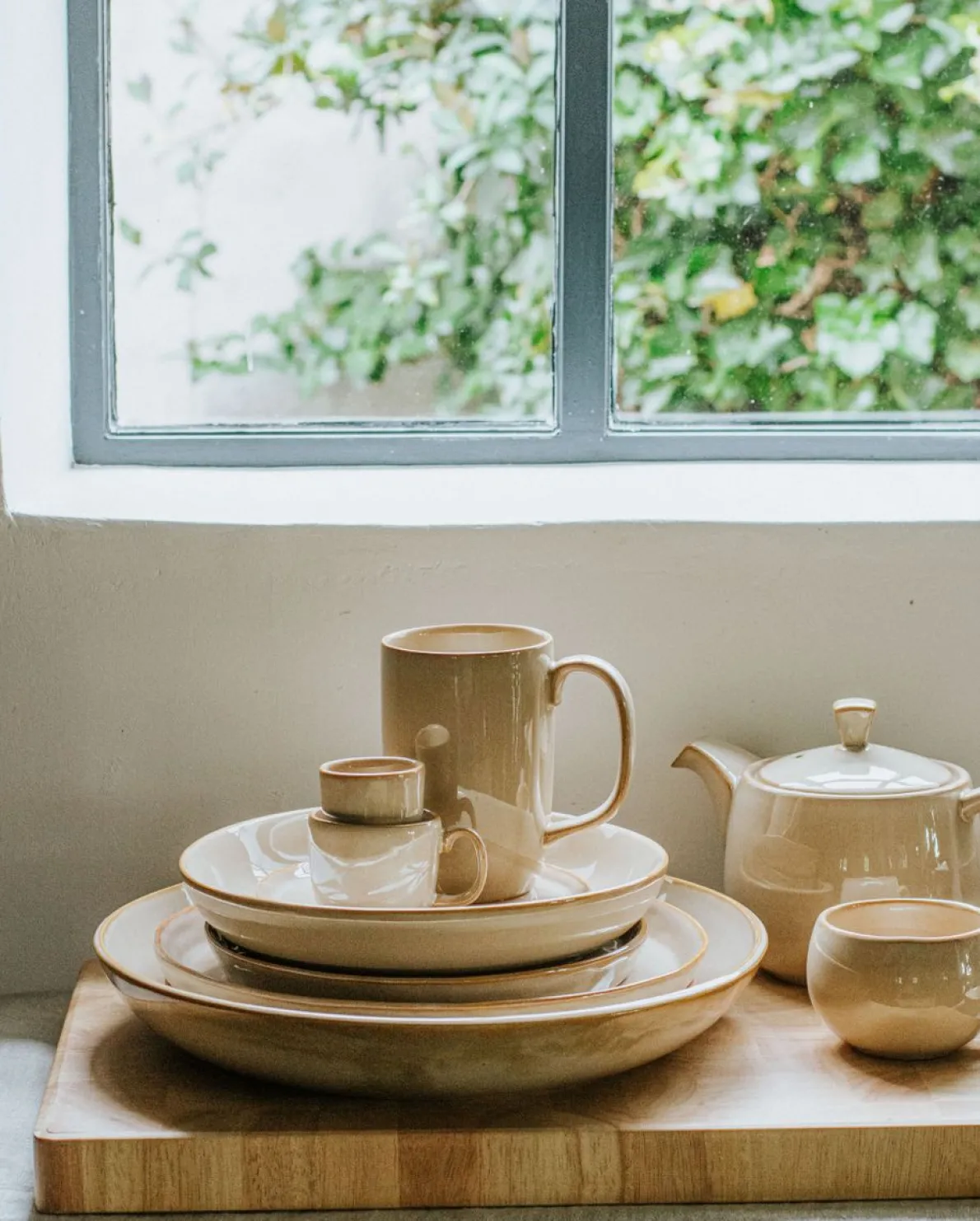 Dit zandkeurige bordhoort bijonzeserviesserie van steengoed met reactief glazuur. Door ditglazuur ontstaat een bijzonder kleurpatroon waardoor ieder item er uniek uitziet en het servies extra glans geeft aan een mooi gedekte tafel.