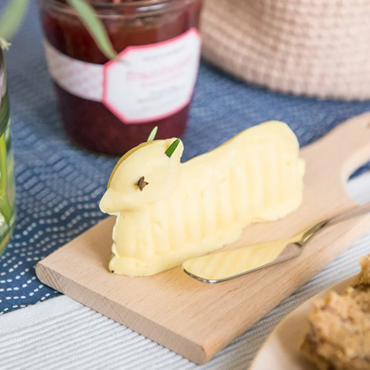 Met dit boterlammetje zet je extra feestelijk je (room)boter op tafel. Leg de houten vormp voor het gebruik een half uur in zout water. Droog het daarna goed af en vul beide helften met koele maar niet al te koude boter. Druk de helften stevig tegen elkaar aan en vul ook de onderkant goed op. Laat het geheel in de koelkast even opstijven, open het vormpje en het boterlammetje is klaar. Voor de oogjes kun je bijvoorbeeld peperkorrels of kruidnagels gebruiken. Gezellig brunchen wordt een feest!