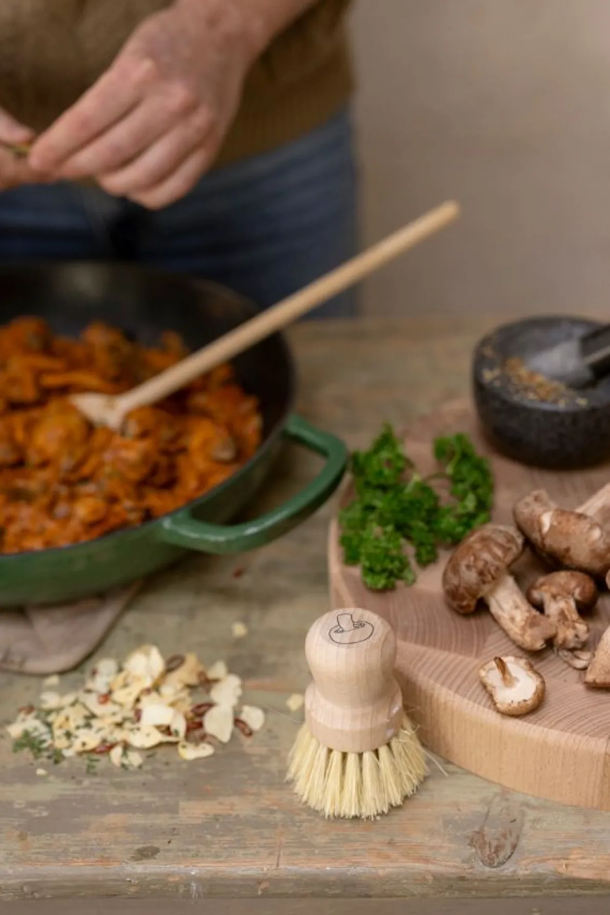 Borsteltje om champignons en andere paddenstoelen mee schoon te borstelen. Was paddenstoelen niet onder de kraan, dan nemen ze veel water op en verliezen ze hun smaak. Handvat is van beukenhout en het borsteltje van tampico, een bladvezel van de agave plant.