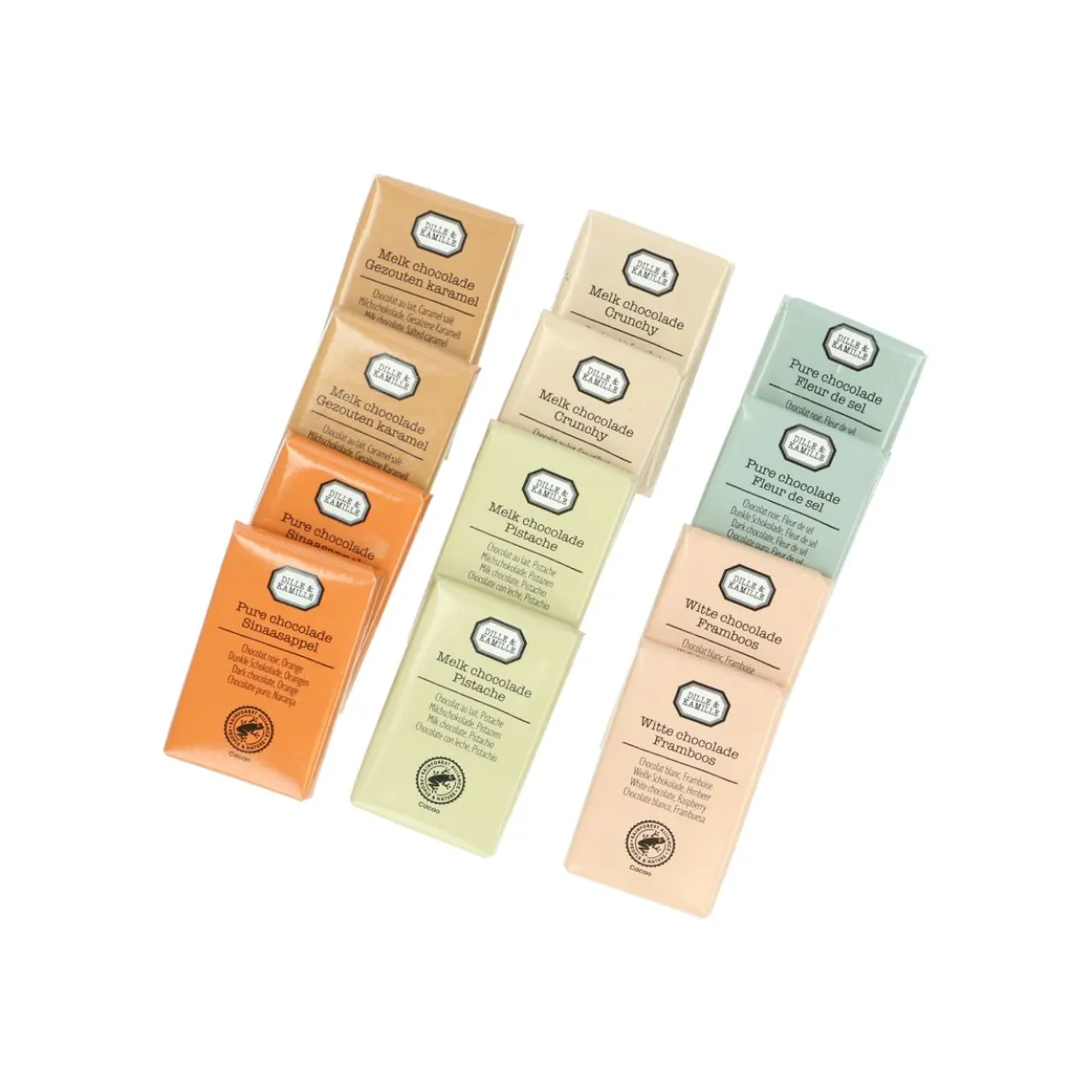Een smaakvol cadeaudoosje met 12 mini-chocoladetabletjes in 6 verschillende smaken, waaronder: melkchocolade/gezouten karamel, melkchocolade/pistache, melkchocolade/crunchy, pure chocolade/fleur de sel, pure chocolade/sinaasappel en witte chocolade/framboos. Leuk als cadeau voor de echte chocoladeliefhebber of om zelf van te genieten. De cacao in deze Belgische chocolade is geproduceerd door Rainforest Alliance-gecertificeerde boerderijen. Wat duurzaamheid betreft, staat de cacao-industrie voor grote uitdagingen op sociaal, economisch en milieugebied. Rainforest Alliance streeft ernaar deze uitdagingen aan te pakken, onder andere met betere landbouwpraktijken die zorgen voor hogere oogstopbrengsten en hogere inkomsten. Maar ook door veiligere arbeidsomstandigheden en het vergroten van de biodiversiteit. Dankzij hun inzet dragen we met deze chocolade bij aan een betere wereld voor mens en natuur. Zo smaakt dat stukje chocolade nog lekkerder!