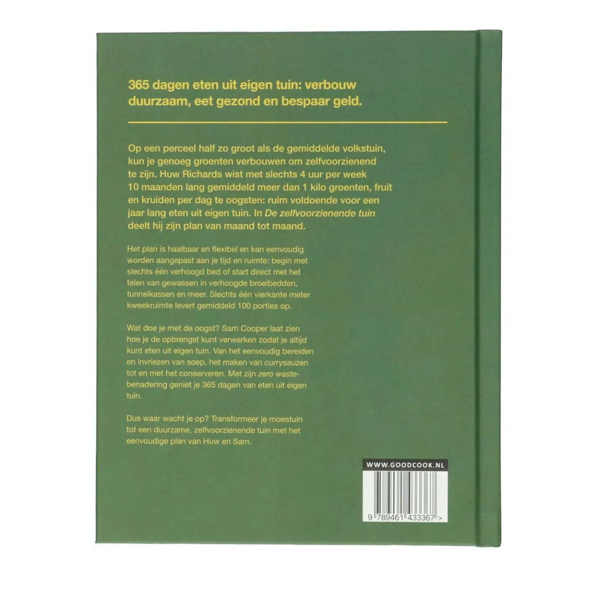 Moestuin- én kookboek ineen: 365 dagen eten uit eigen tuin Op een perceel half zo groot als de gemiddelde volkstuin, kun je genoeg groenten verbouwen om zelfvoorzienend te zijn. Huw Richards wist met slechts 4 uur per week, 10 maanden lang, gemiddeld meer dan 1 kilo groenten, fruit en kruiden per dag te oogsten: ruim voldoende voor een jaar lang eten uit eigen tuin. In De zelfvoorzienende tuin deelt hij zijn plan van maand tot maand. Het plan is haalbaar, flexibel en kan eenvoudig worden aangepast aan je tijd en ruimte: begin met slechts één verhoogd bed of start direct met het telen van gewassen in broeibedden, tunnelkassen en meer. Slechts één vierkante meter kweekruimte levert gemiddeld 100 porties op. Wat doe je met de oogst? Sam Cooper laat zien hoe je de opbrengst kunt verwerken zodat je áltijd kunt eten uit eigen tuin. Van het eenvoudig bereiden en invriezen van soep, het maken van currysauzen tot en met het conserveren. Met zijn zero waste benadering geniet je 365 dagen van eten uit eigen tuin. Dus waar wacht je op? Transformeer je moestuin tot een duurzame, zelfvoorzienende tuin met het eenvoudige plan van Huw en Sam.