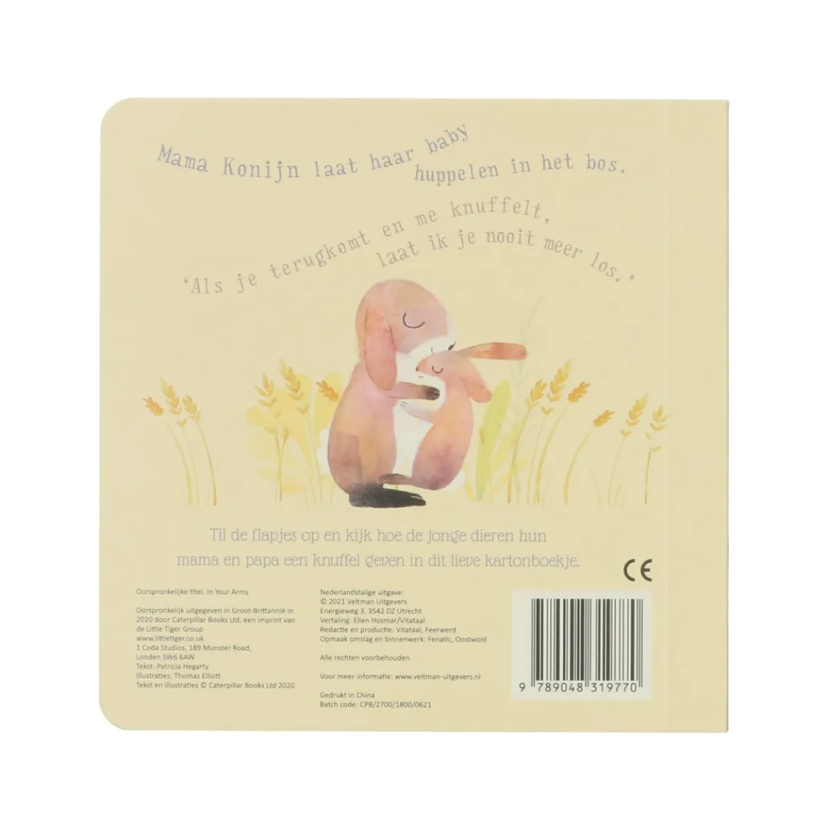 Mama Konijn laat haar baby huppelen in het bos. ‘Als je terugkomt en me knuffelt, laat ik je nooit meer los.’ Til de flapjes op en kijk hoe de jonge dieren hun mama en papa een knuffel geven in dit lieve kartonboekje.