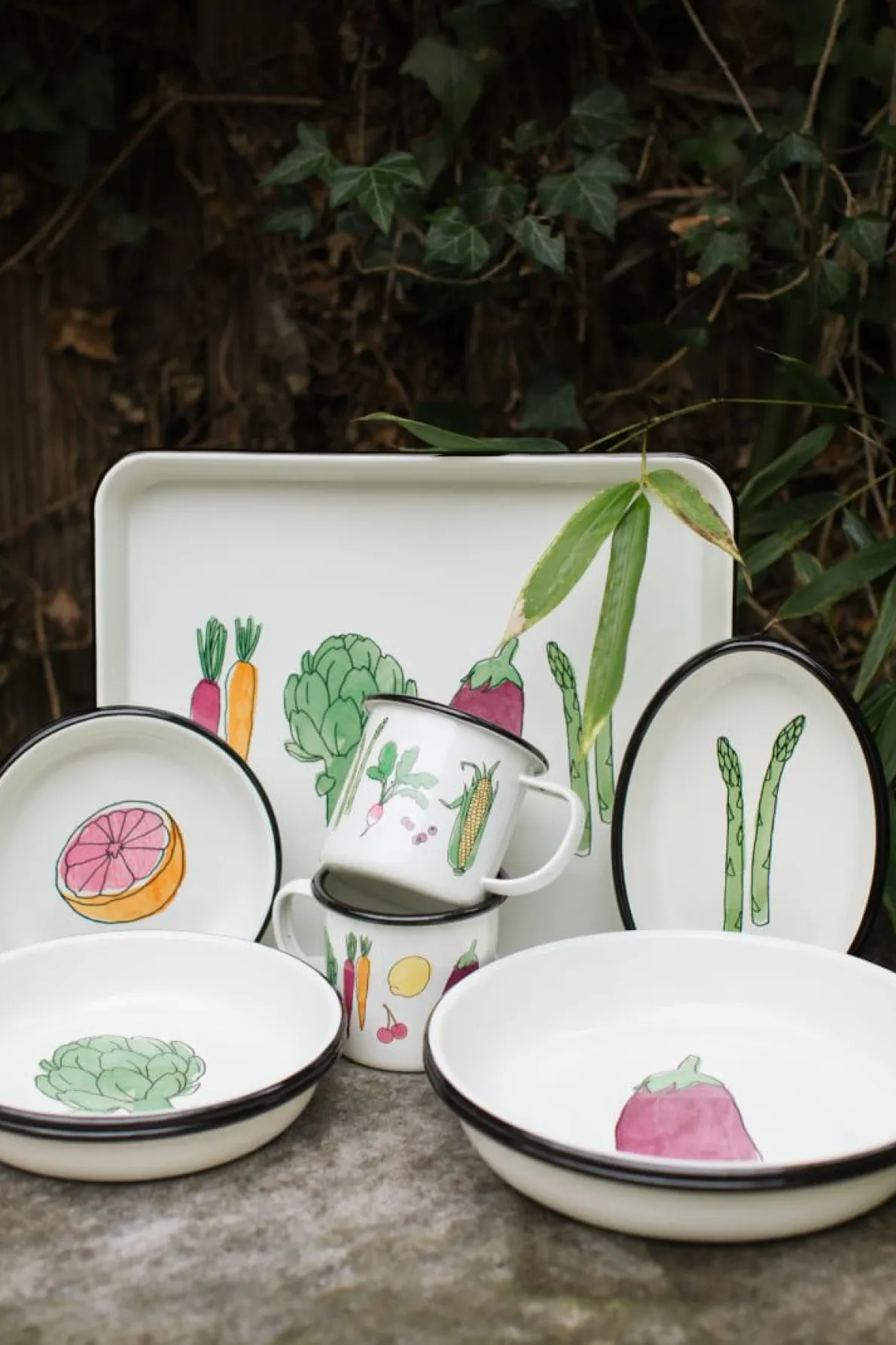 Rechthoekig dienblad met opstaande rand, wit geëmailleerd met een zwarte rand en geïllustreerd met groenten. Voor het serveren van koffie en thee, ook leuk voor kleine hapjes.