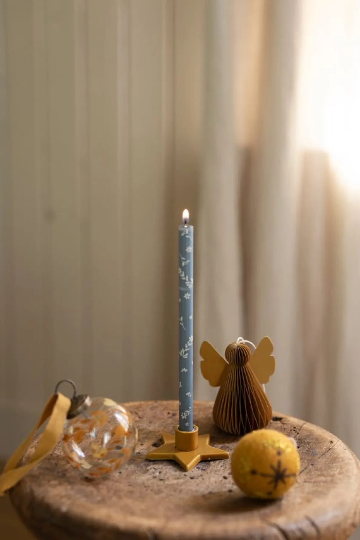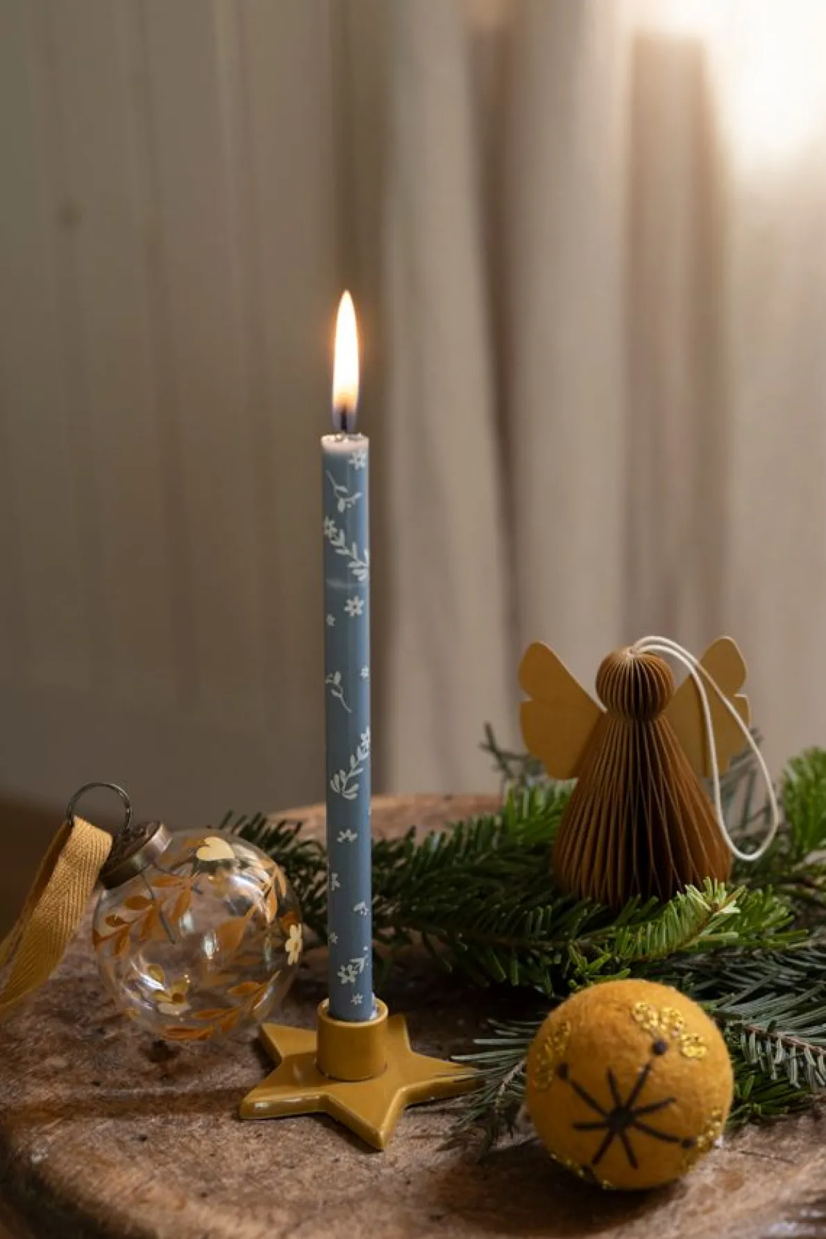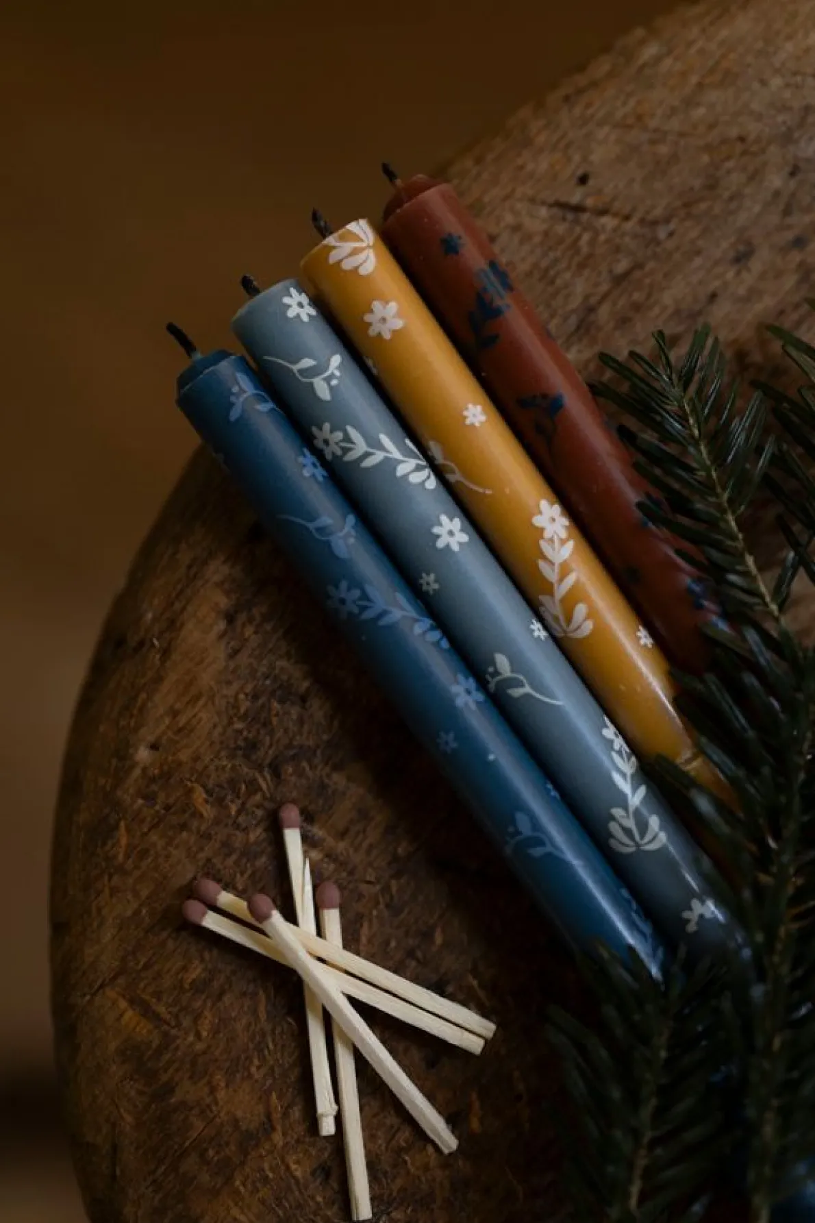 Set van 4 dunne kaarsen in twee tinten blauw en in een gele en rode tint. De kaarsen zijn bedrukt met fijne takjes en stippen en verpakt in een kartonnen doosje.