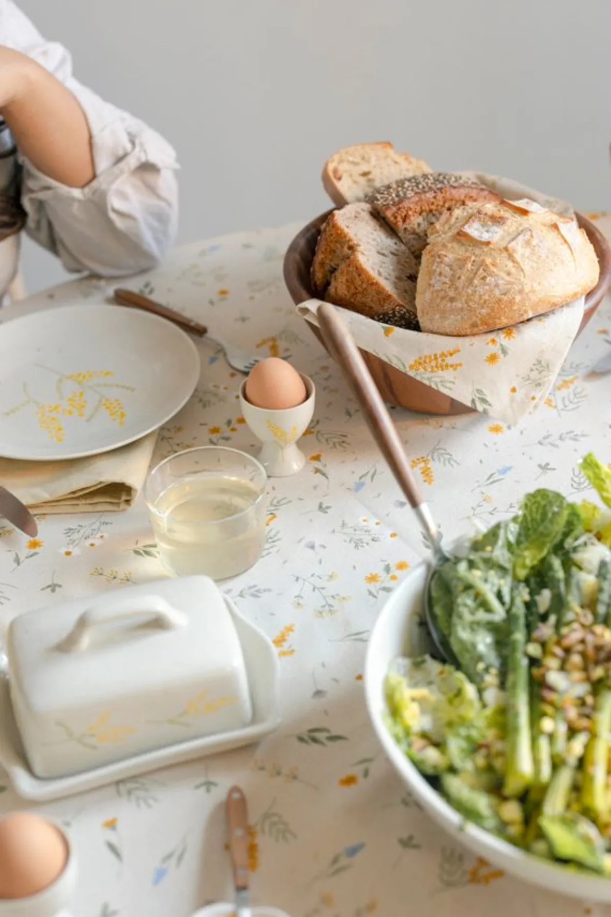 Dit eierdopje is onderdeel van een serviesreeks. Een mimosa servies van steengoed met beige basisglazuur en bruine spikkels. Het mimosapatroon wordt handmatig met een stempel op het servies gedrukt. Het gestempelde gedeelte krijgt een waslaag en daarna een transparante glazuurlaag. In de oven smelt de was weg en zo ontstaat een subtiel reliëf en voelen de illustraties wat ruw aan. Het dessin is een eigen ontwerp van Dille & Kamille! Mooi om te combineren met de andere onderdelen van dit servies.