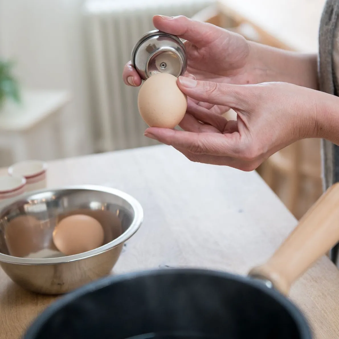De eierprikker voorkomt dat eieren tijdens het koken barsten. Met behulp van de eierprikker wordt een gaatje in de bolle kant van het ei geprikt, waardoor de lucht kan ontsnappen en het ei heel blijft. Gemaakt van roestvrij staal, geschikt voor de afwasmachine.