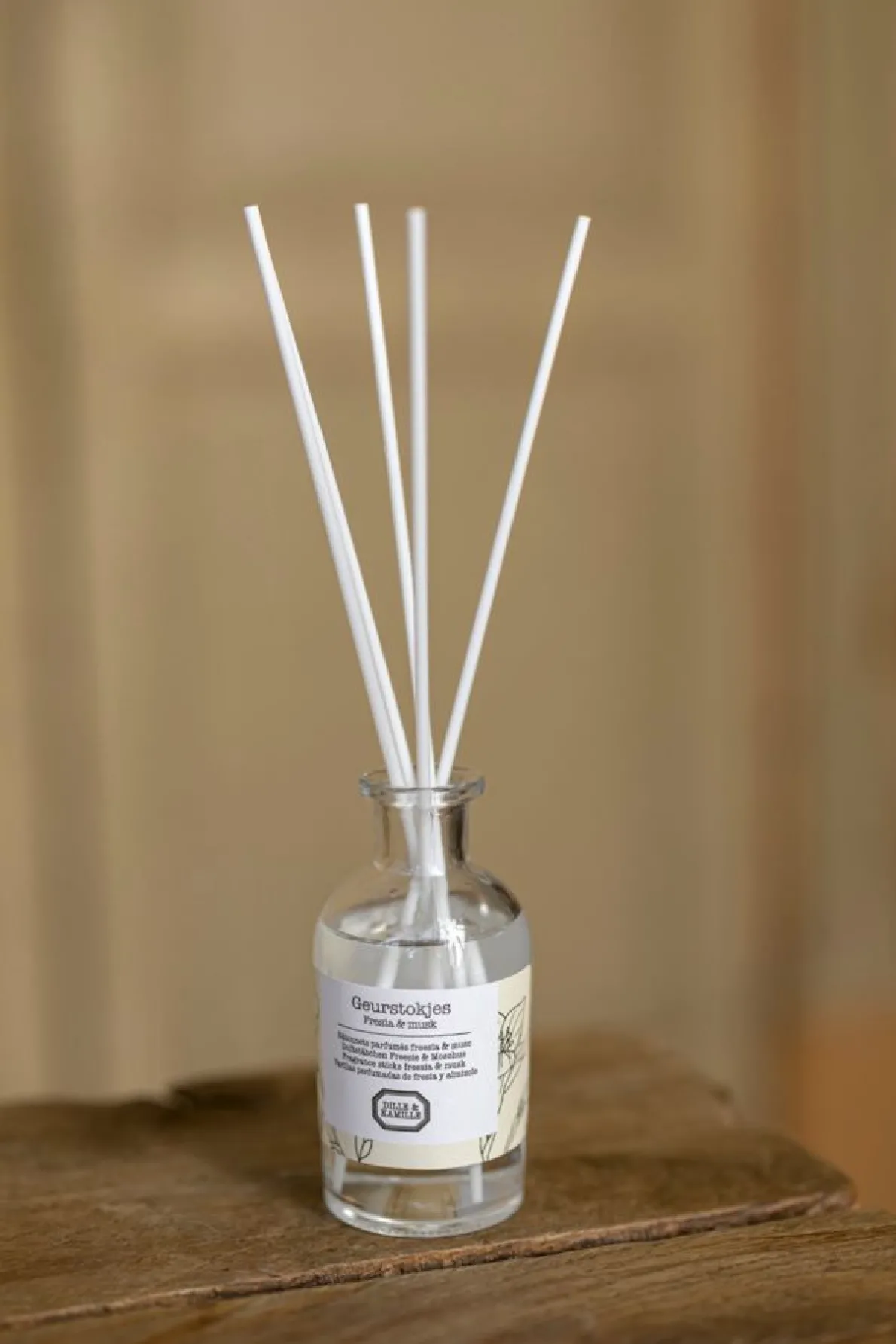 Met deze geurstokjes geef je je huis de heerlijke geur van fresia’s gecombineerd met de stoere geur van musk. Zet, afhankelijk van de grootte van de ruimte, een of meer stokjes in het flesje. De stokjes zuigen zich vol en laten de geur geleidelijk verdampen. Voor een intensere geur draai je de stokjes om. Let op: Buiten bereik van kinderen houden. Bij contact met de huid of de ogen, met veel water wassen en spoelen. Bij huidirritatie of uitslag een arts raadplegen.