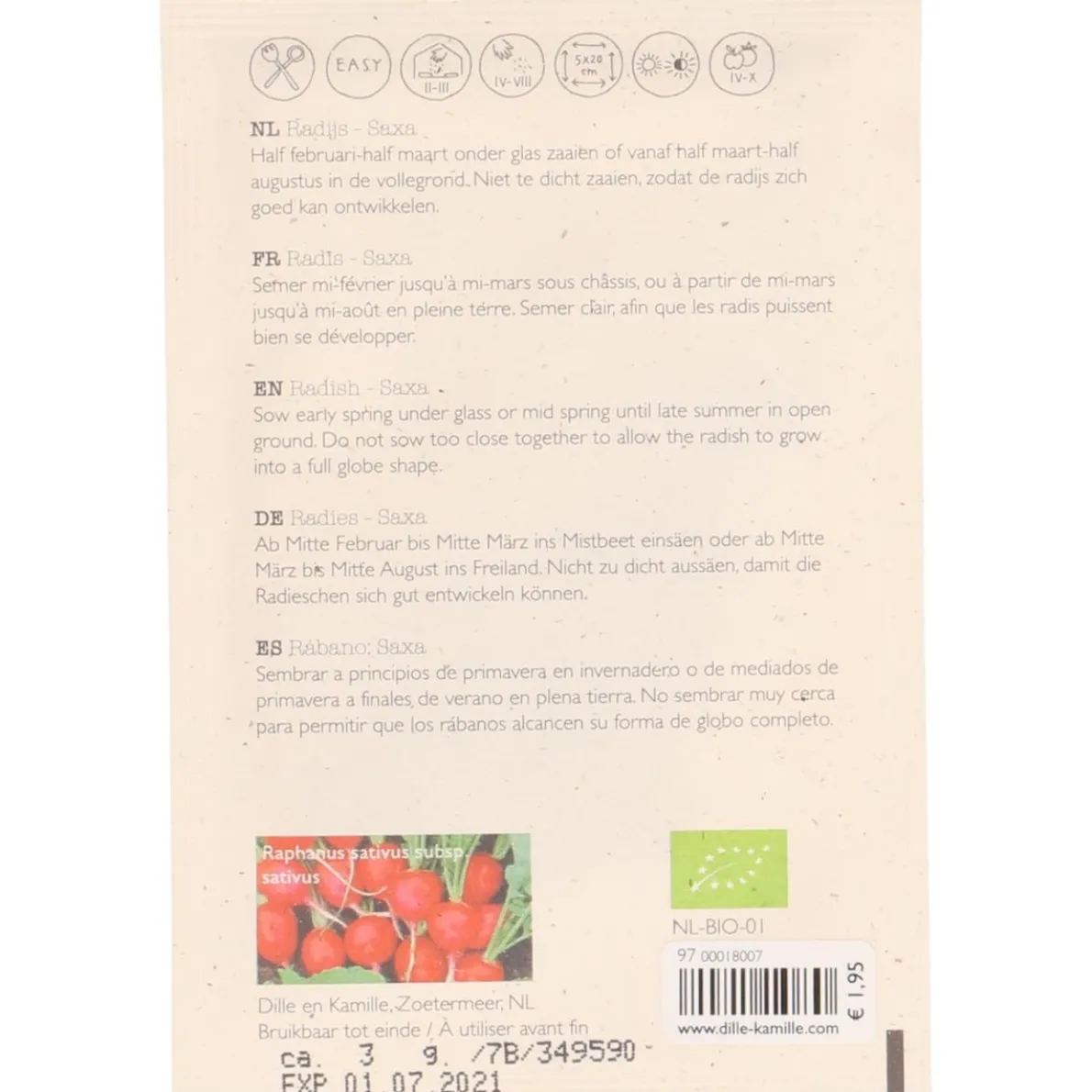 augustus in de vollegrond. Niet te dicht zaaien, zodat de radijs zich goed kan ontwikkelen.