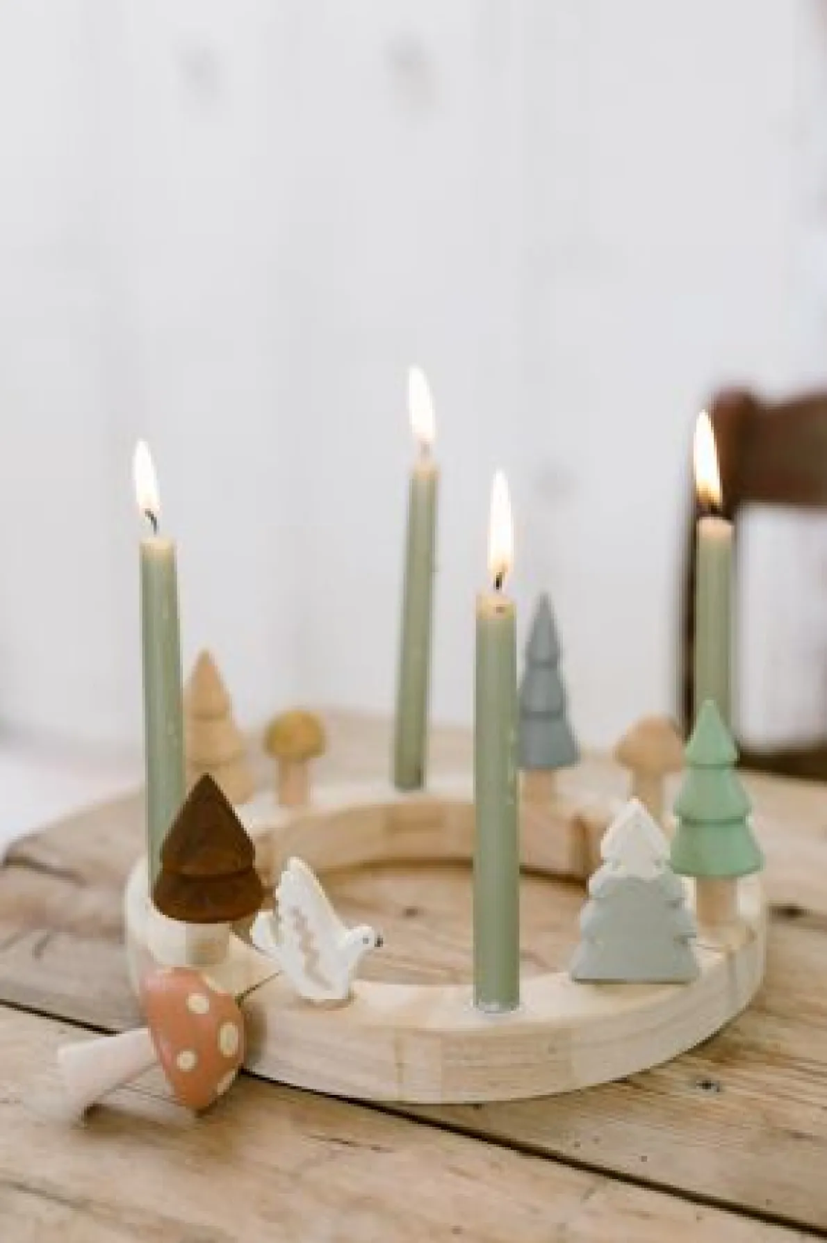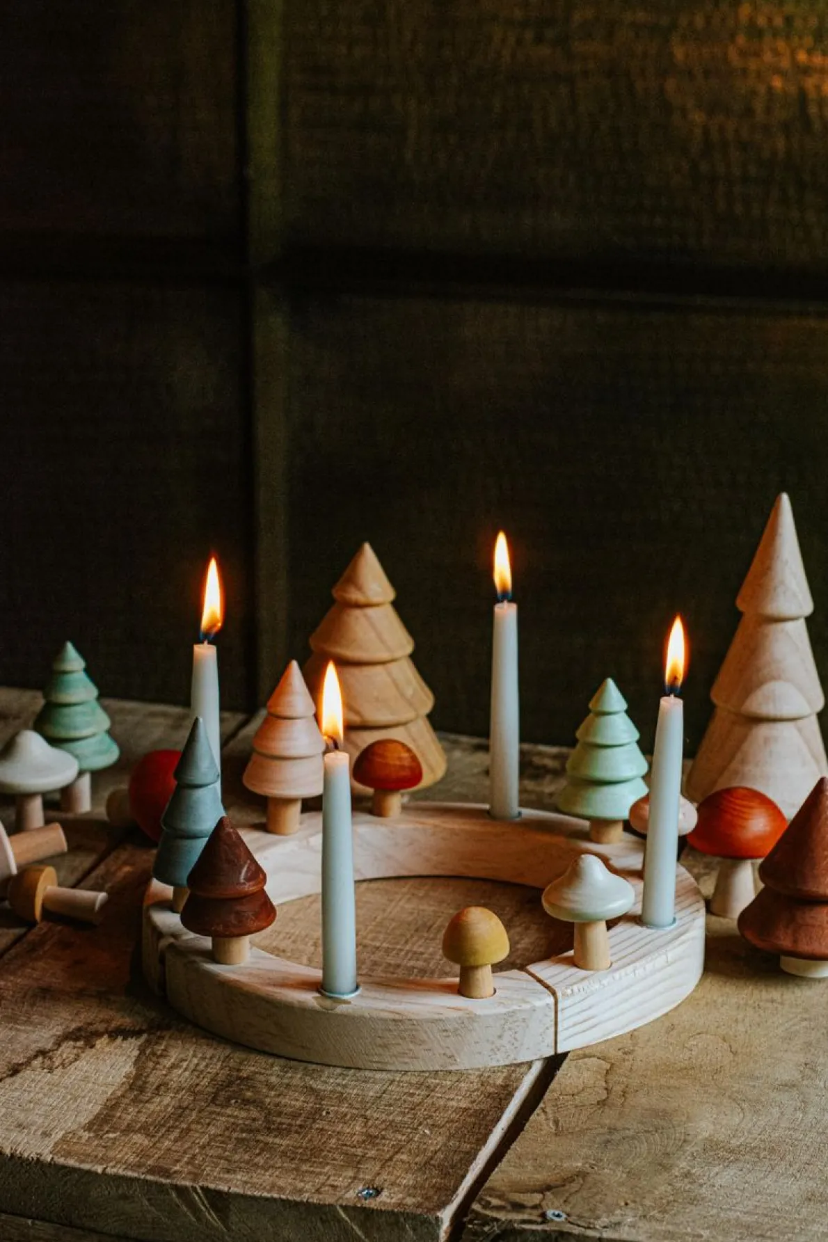 Unieke houten jaarring met dennenbomen- en paddenstoeltjes-stekers. Deze prachtig afgewerkte houten jaarring bestaat uit een cirkel in vier losse delen. De set bevat 8 jaarring stekers: vier verschillende houten dennenbomen en vier unieke paddenstoeltjes, die je naar wens kunt verplaatsen dankzij de losse stekers. Bovendien is er ruimte voor vier kaarsjes met een diameter van ongeveer Ø 1,2 cm. (Kaarsjes worden niet bij de jaarring mee geleverd.)Hierdoor kun je de jaarring heel goed voor de adventsperiode gebruiken, om de dagen tot je verjaardag af te tellen, of om de jaarring aan te passen aan de seizoenen. Natuurlijk kun je hem ook gewoon als sfeervolle decoratie gebruiken!