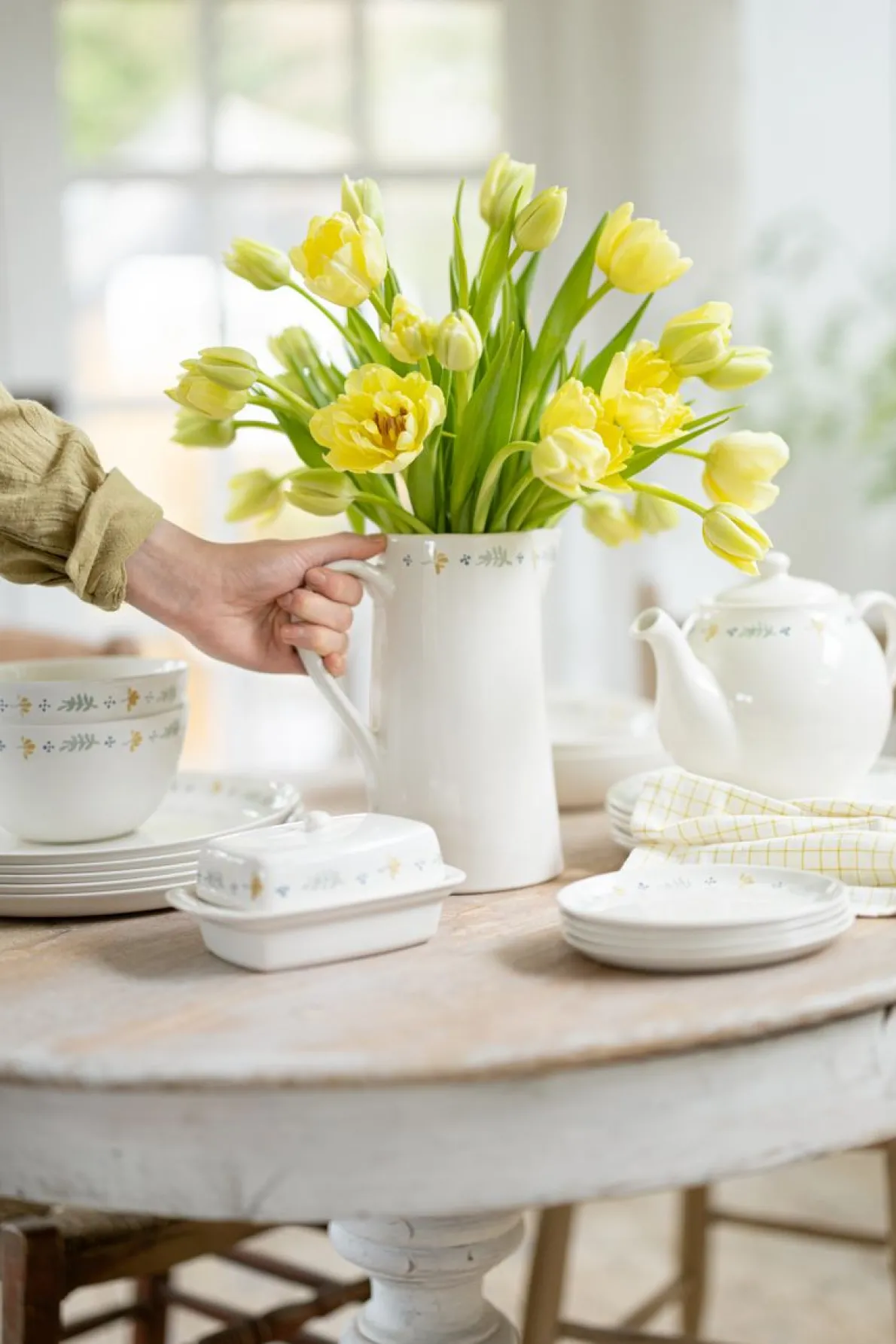 Elegante, hoge kan voor bijvoorbeeld vruchtensap, melk of water. Of gebruik de kan als vaas voor een mooie bos bloemen! Deze kan is onderdeel van een serviesserie. Een mooi servies van steengoed bedrukt met strooitakjes. Steengoed is een extra sterke soort aardewerk. Het dessin is een eigen ontwerp van Dille & Kamille.