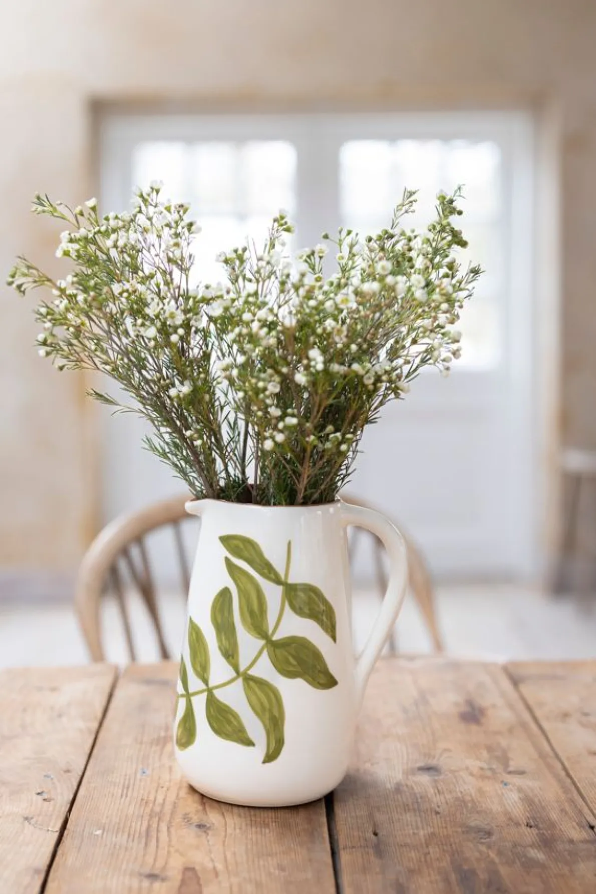Elegante, hoge kan voor bijvoorbeeld vruchtensap, melk of water. Of gebruik hem als vaas voor een mooie bos bloemen. De kan is onderdeel van een serviesserie. Een zomers servies van geglazuurd terracotta, gemaakt en handgeschilderd in Portugal. Met dit servies creëer je een warme Mediterrane sfeer op tafel. De kan heeft een geglazuurde crèmekleurige buitenkant en een terracotta binnenkant. Erg mooi in combinatie met de andere onderdelen van dit servies en leuk om te gebruiken met bijv. onze kommetjes en serveerplanken van hout. Het dessin is een eigen ontwerp van Dille & Kamille.