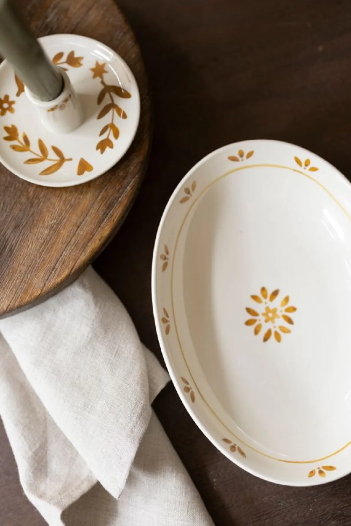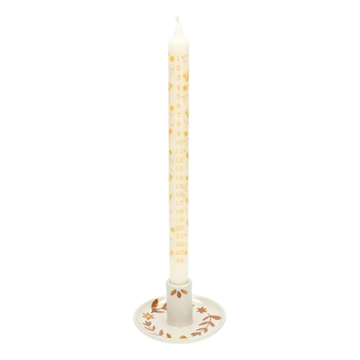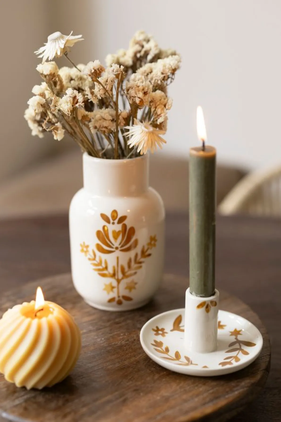 Mooie kandelaar van steengoed met handbeschilderde takjes in een warme oker kleur. De kandelaar is geschikt voor onze dinerkaarsen en leuk om te combineren met de handbeschilderde vaasjes en andere kandelaren, bijv. van hout en glas.
