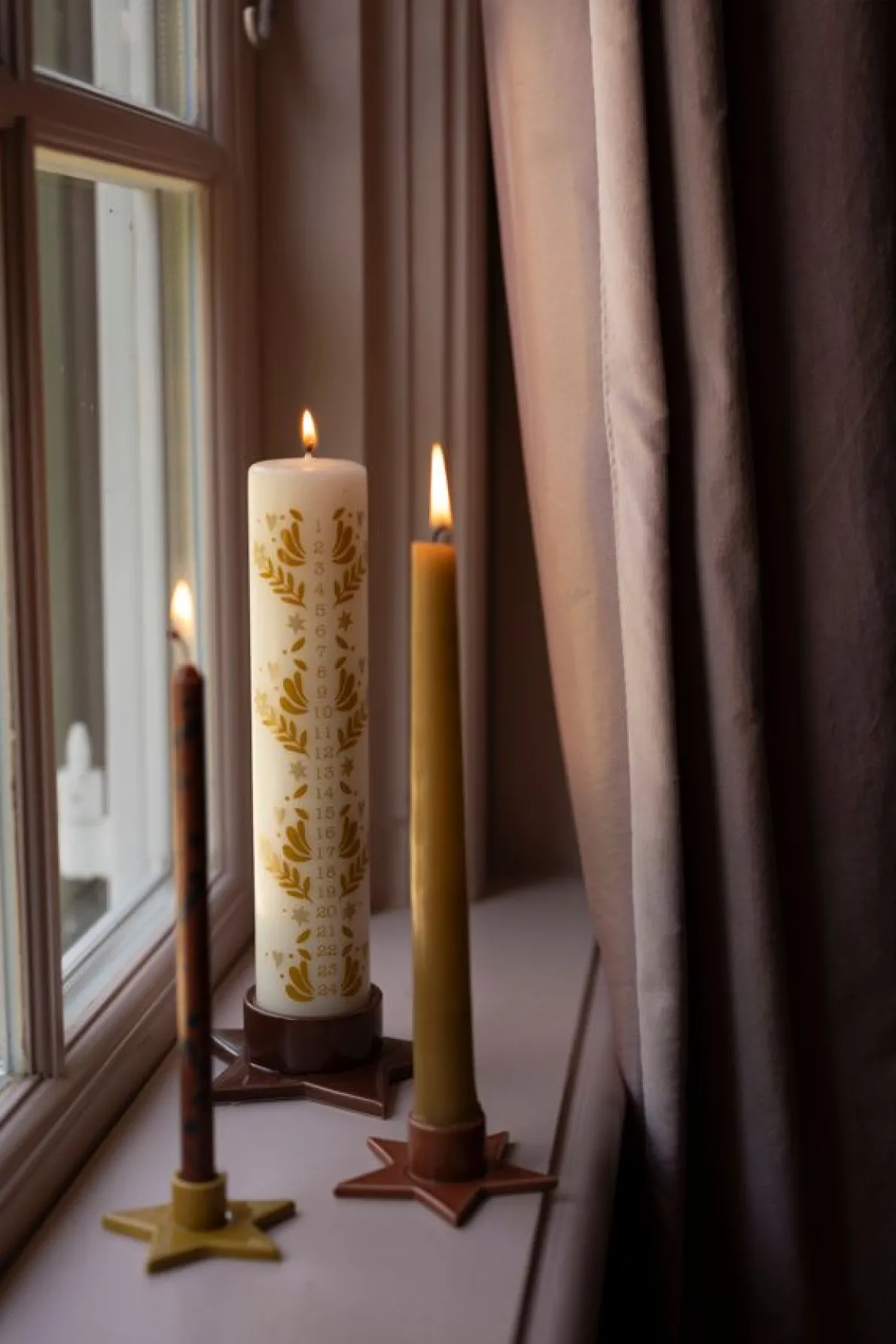 Sfeervolle, klassieke kerstkandelaar van porselein, in de vorm van een kerstster met vijf punten. In de kandelaar past onze minikaars met doorsnede 1,2 cm. Deze kerstkandelaar is zowel mooi om alleen neer te zetten als in een groepje met andere kandelaars.