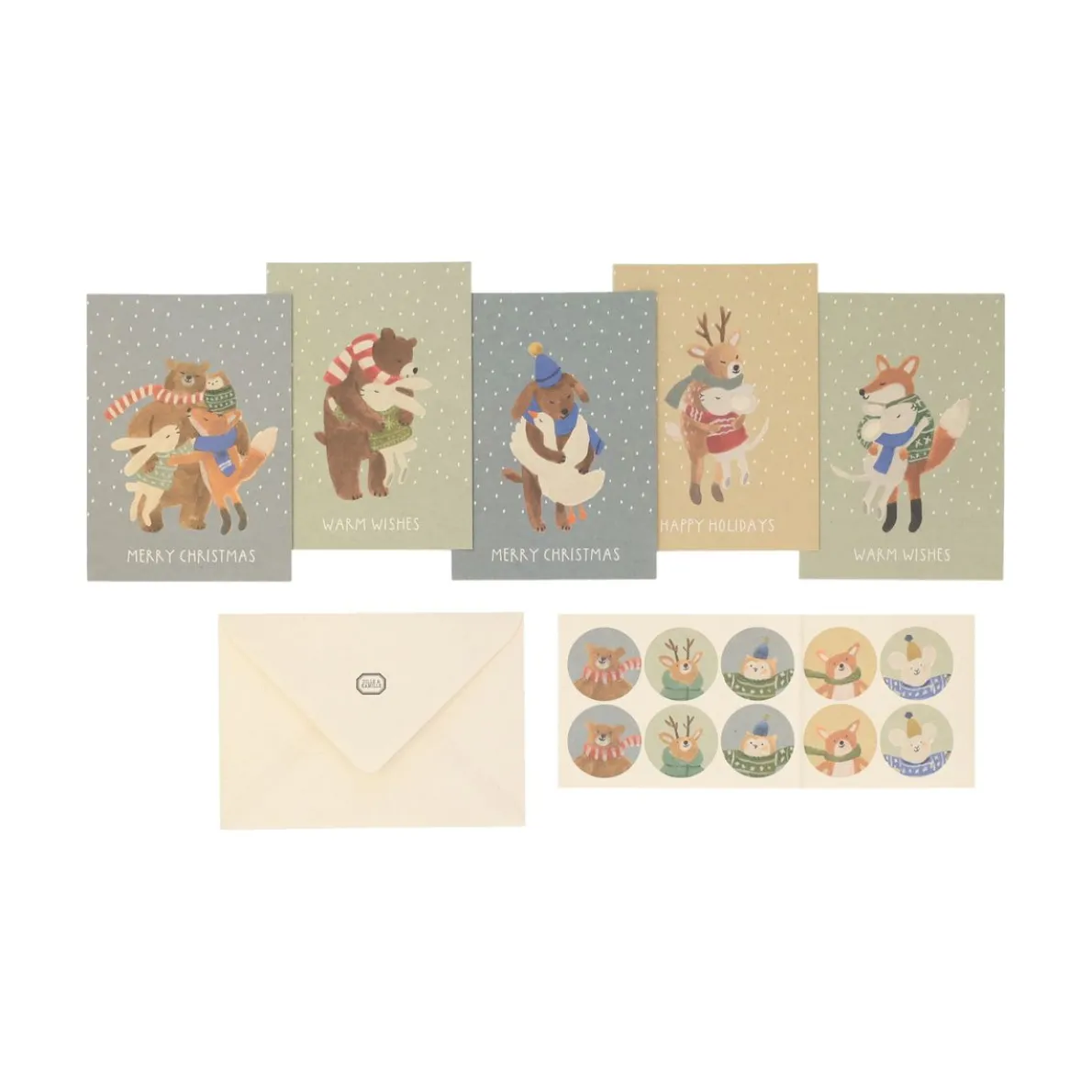 Stuur je liefste wensen aan iedereen die je dierbaar is, met deze 10 dubbele wenskaarten, enveloppen en ronde sluitstickers. De kaarten zijn speciaal ontworpen voor Dille & Kamille en bedrukt met knuffelde dieren, er zijn 5 verschillende soorten. De enveloppen sluit je met de bijpassende stickers. Deze kerstkaarten zijn verpakt in een kartonnen doos.