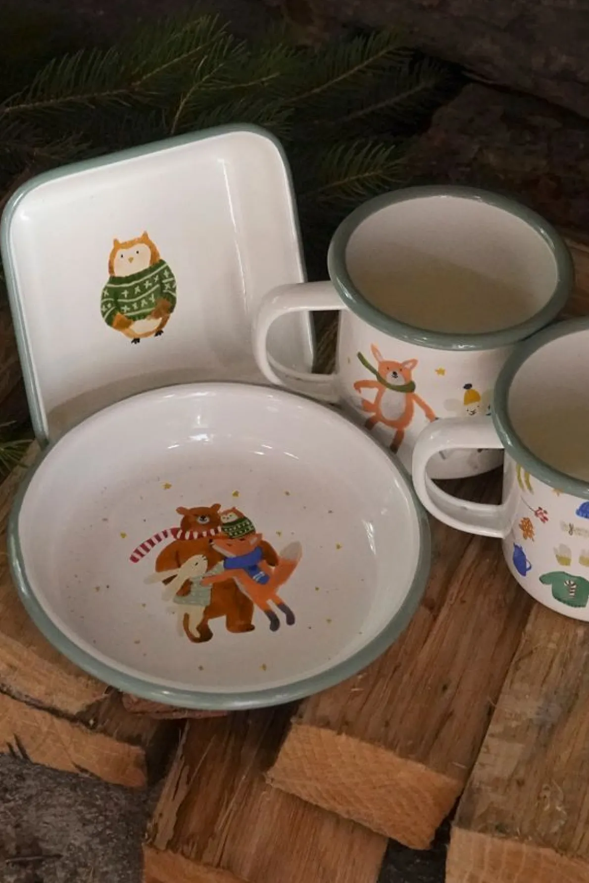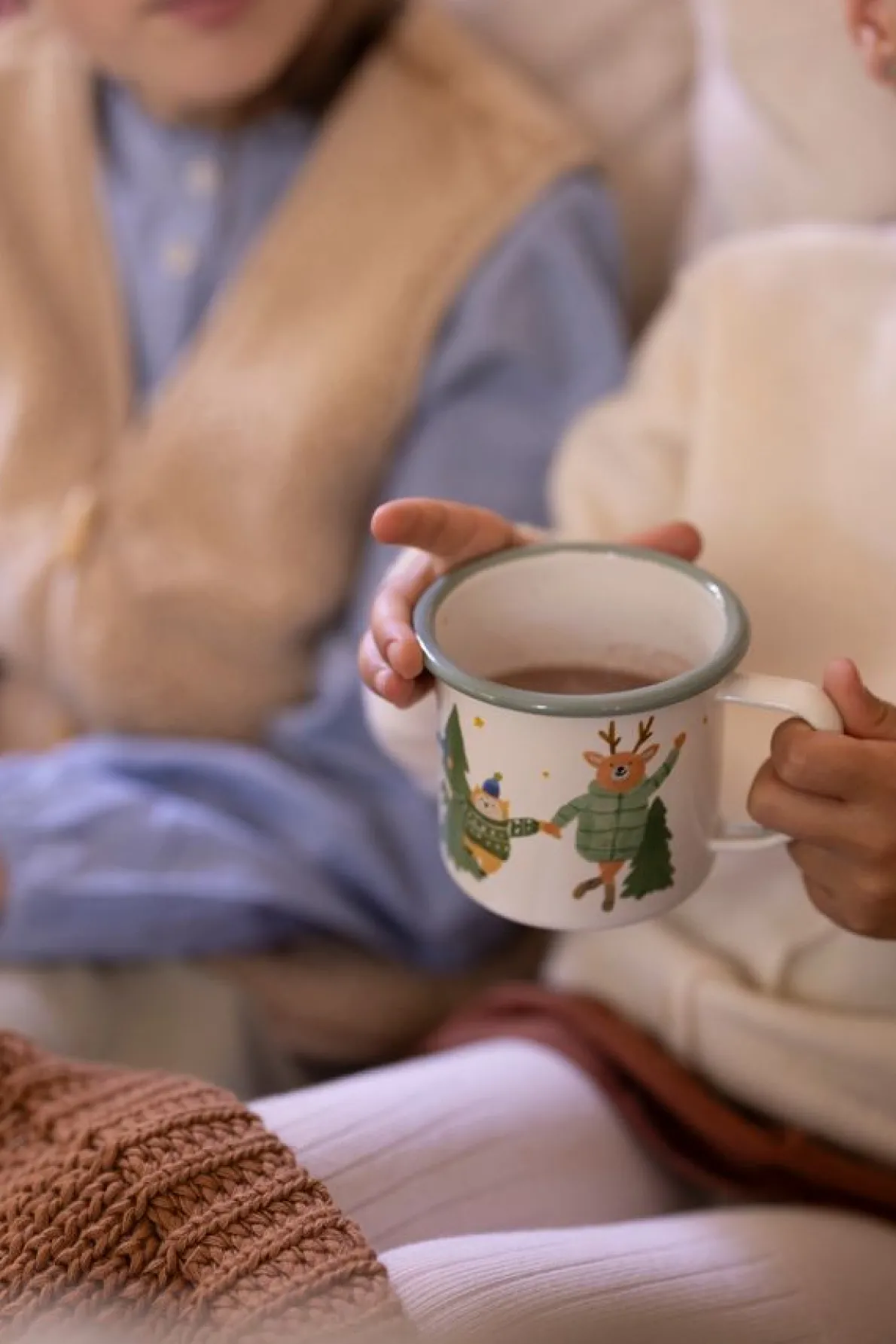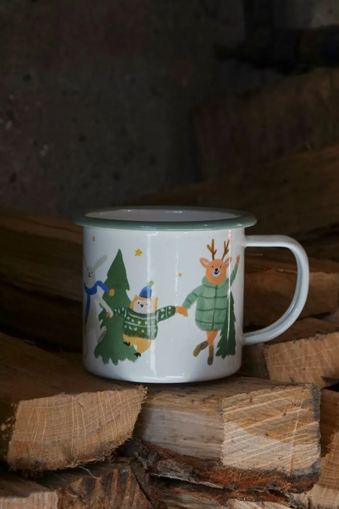 Dat smaakt extra lekker: warme chocolademelk of kerstthee uit deze vrolijke emaillen beker. De beker is bedrukt met dansende dieren rond de kerstboom. De ondergrond is offwhite, de beker heeft een grijsgroen randje. De afbeelding is speciaal ontworpen voor Dille & Kamille. Emaille is licht van gewicht dus deze beker neem je ook makkelijk mee op een winterwandeling, samen met onze thermosfles bijvoorbeeld.