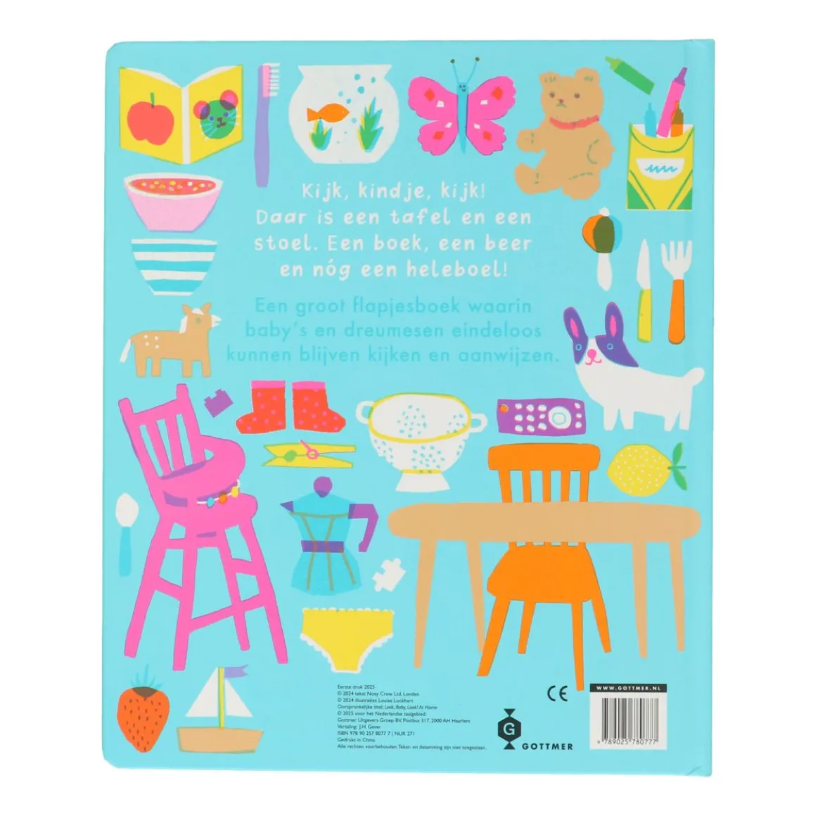 “Dit stevige prentenboek is het ideale hulpmiddel bij het opbouwen van de woordenschat van dreumesen. Een aanwijsboek is een leuke manier om woordjes met je kindje te oefenen. In ‘Kijk, kindje, kijk – Thuis’ kunnen kinderen allerlei voorwerpen uit hun dagelijks leven ontdekken, benoemen en herkennen. Een fluitketel bijvoorbeeld, een houten huis voor de poppen of sop om lekker grote bubbels in het bad te maken.Het babyboek heeft een groot formaat en stevige flappen, bestand tegen veelvuldig lezen en kijken. Het bevat meer dan honderd alledaagse voorwerpen voor dreumesen om te herkennen, aan te wijzen en over te praten – gerangschikt op thema’s als de keuken, de badkamer en de slaapkamer.De vrolijke illustraties van Louise Lockhart, bekend van de Tummy Time-boekjes, zijn gedrukt in opvallende felle kleuren. Dit maakt ‘Kijk, kindje, kijk – Thuis’ absoluut een van de stijlvolste babyboeken van het moment! Voor kinderen vanaf 12 maanden.”