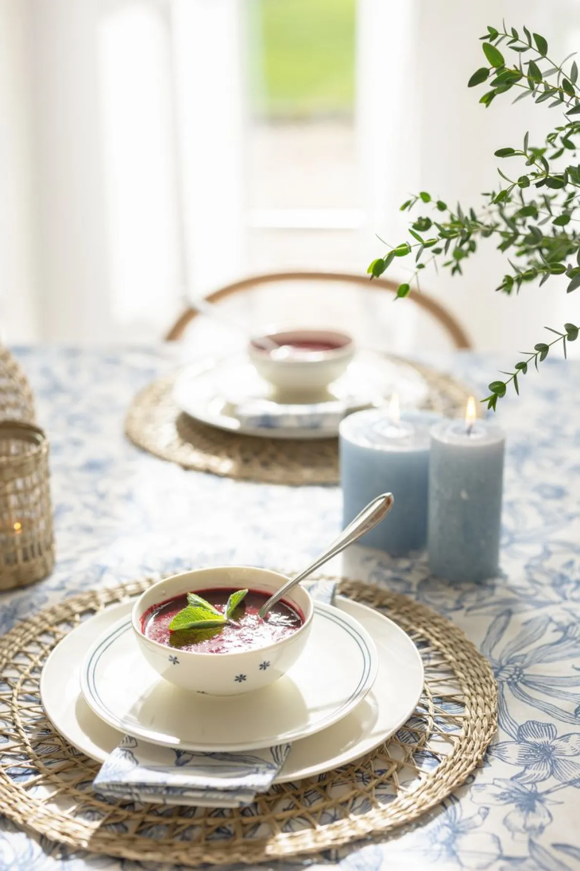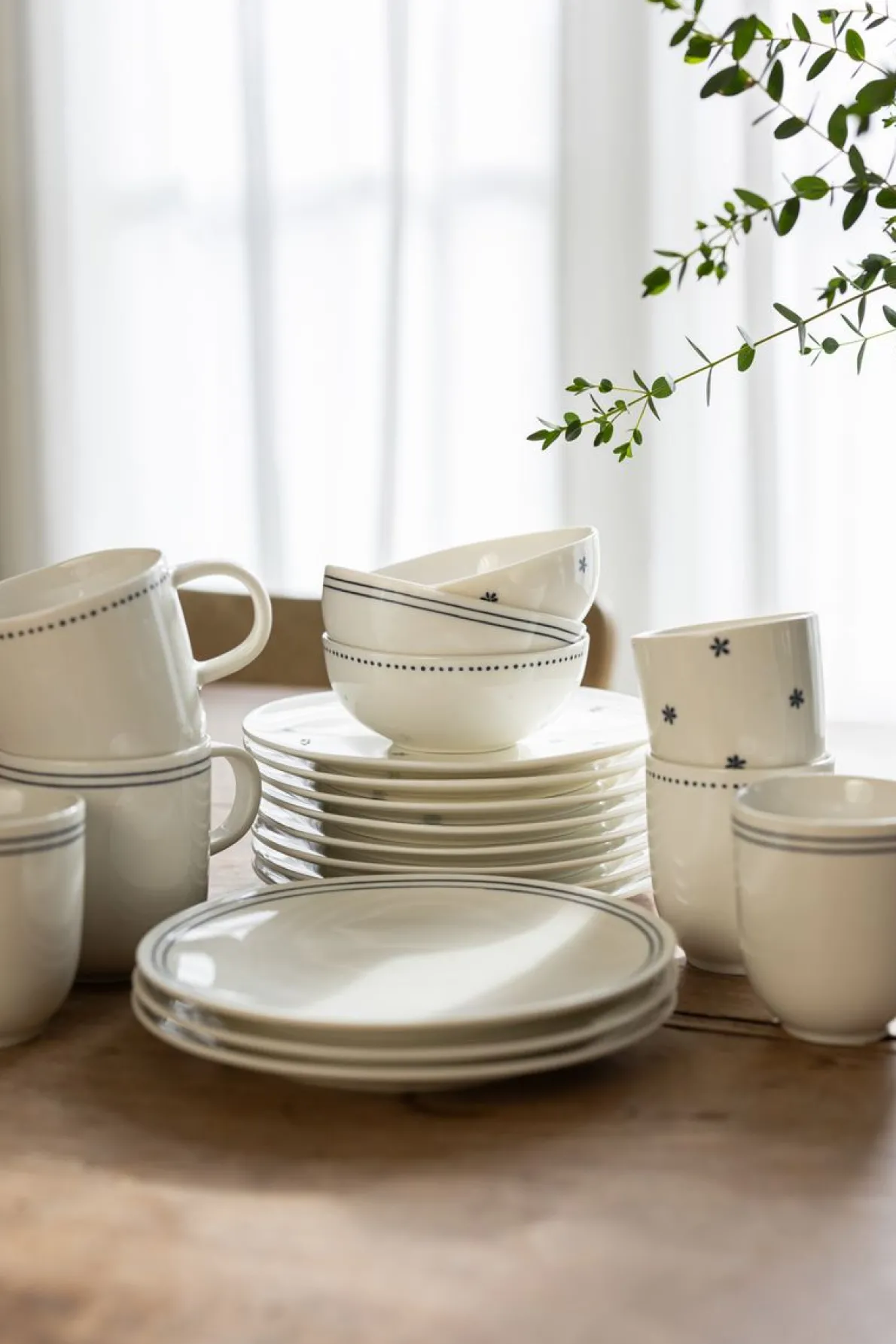 Ideaal voor je muesli of havermout, rauwkost en salade, dips en sausjes, soep, bowl gerechten, om tijdens het koken voorgesneden groente etc. in klaar te zetten: kommetjes heb je nooit genoeg. De kom is onderdeel van een serviesserie bestaande uit een beker, ontbijtbordje, theemok en dit kommetje. Een mooi organisch servies van porselein en verkrijgbaar in drie verschillende dessins. De donkerblauwe bloemetjes zijn een decal. Dit is een speciale folie dat op hoge temperatuur in de oven op het servies wordt gebrand. Het servies kan daardoor in de vaatwasser. De verschillende printjes – ontworpen door Dille & Kamille – passen leuk bij elkaar, maar zijn ook een mooie aanvulling op ons organisch gevormde witte servies.