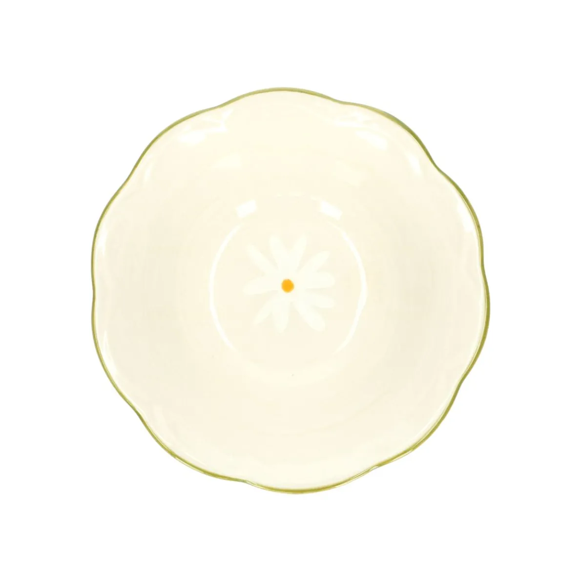 Leuke kom van steengoed met een schattig groen schulprandje en handgeschilderde wilde bloemen aan de buitenkant en in het midden van het schaaltje. Deze kom is onderdeel van serviesserie. Mooi om te combineren met de andere onderdelen van dit servies of met ons effen ‘beige spikkel’ servies. Leuk om bij de koffie of thee je koekjes in te serveren of om te gebruiken voor je yoghurt of een dessert! Steengoed is een extra sterke soort aardewerk. Het dessin is een eigen ontwerp van Dille & Kamille.