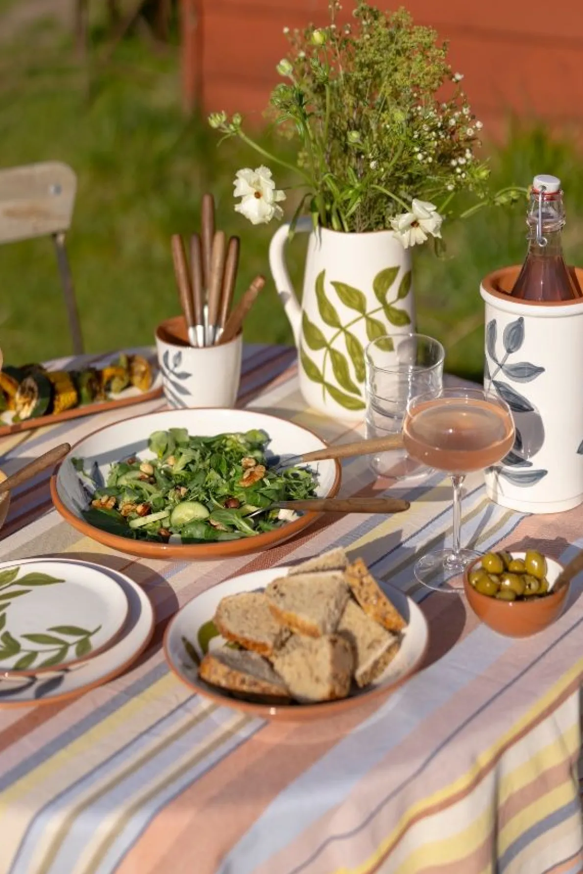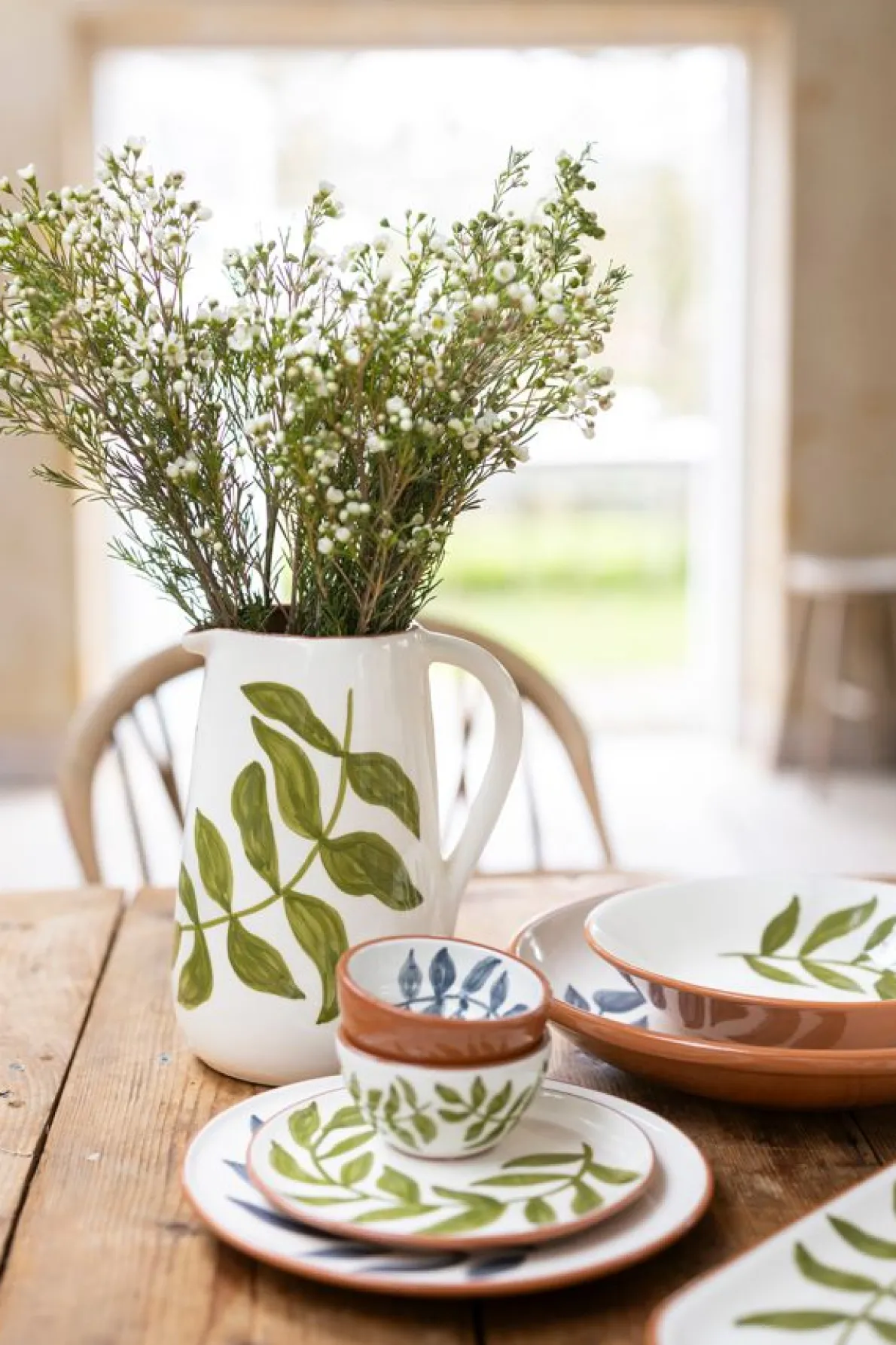 Ideaal voor je rauwkost en salade, soep, bowl gerechten, om tijdens het koken voorgesneden groente etc. in klaar te zetten: kommetjes heb je nooit genoeg. Deze kom is onderdeel van een serviesserie. Een zomers servies van geglazuurd terracotta, gemaakt in Portugal. Met dit servies creëer je een warme Mediterrane sfeer op tafel. Of serveer er heerlijke gerechtjes en snacks in. De kom heeft een geglazuurde crèmekleurige binnenkant en een terracotta buitenkant. De bladeren zijn met de hand geschilderd. Erg mooi in combinatie met de andere onderdelen van dit servies en leuk om te gebruiken met bijv. onze kommetjes en serveerplanken van acaciahout. Het dessin is een eigen ontwerp van Dille & Kamille.