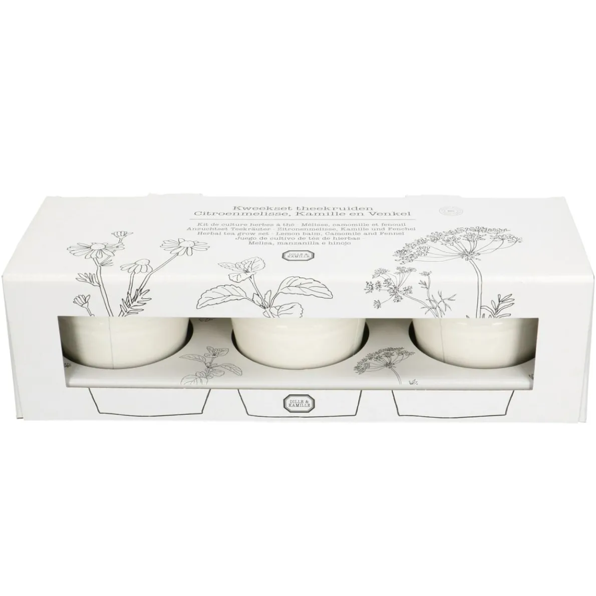 Citroenmelisse, Kamille en Venkel: 3 heerlijke theekruiden om je eigen, verse thee te kunnen zetten en drinken. Met deze kweekset kun je eenvoudig zelf, in de meegeleverde zinken potjes en met kokostabletten, je eigen tuinkruiden laten groeien op je aanrecht, in de vensterbank of op een andere lichte plek in huis. Voor snel resultaat zaai je eerst binnen voor, op een licht, warme (20°) vensterbank. Als de tuinkruiden volgroeid zijn, kun je ze overplanten in de tuin of op in potten op je terras.