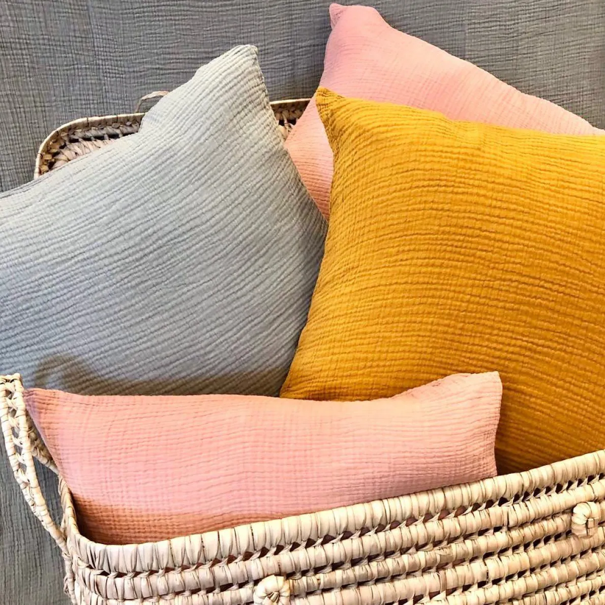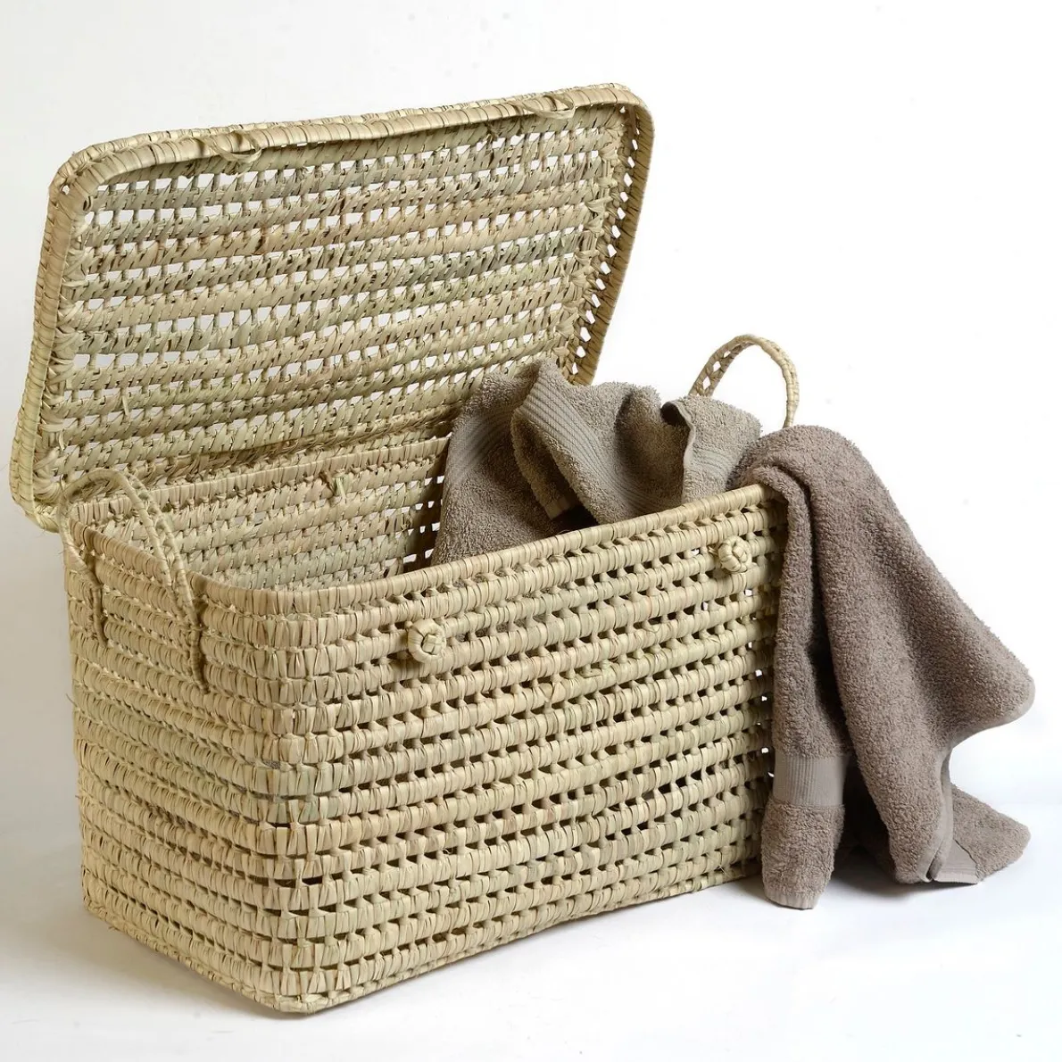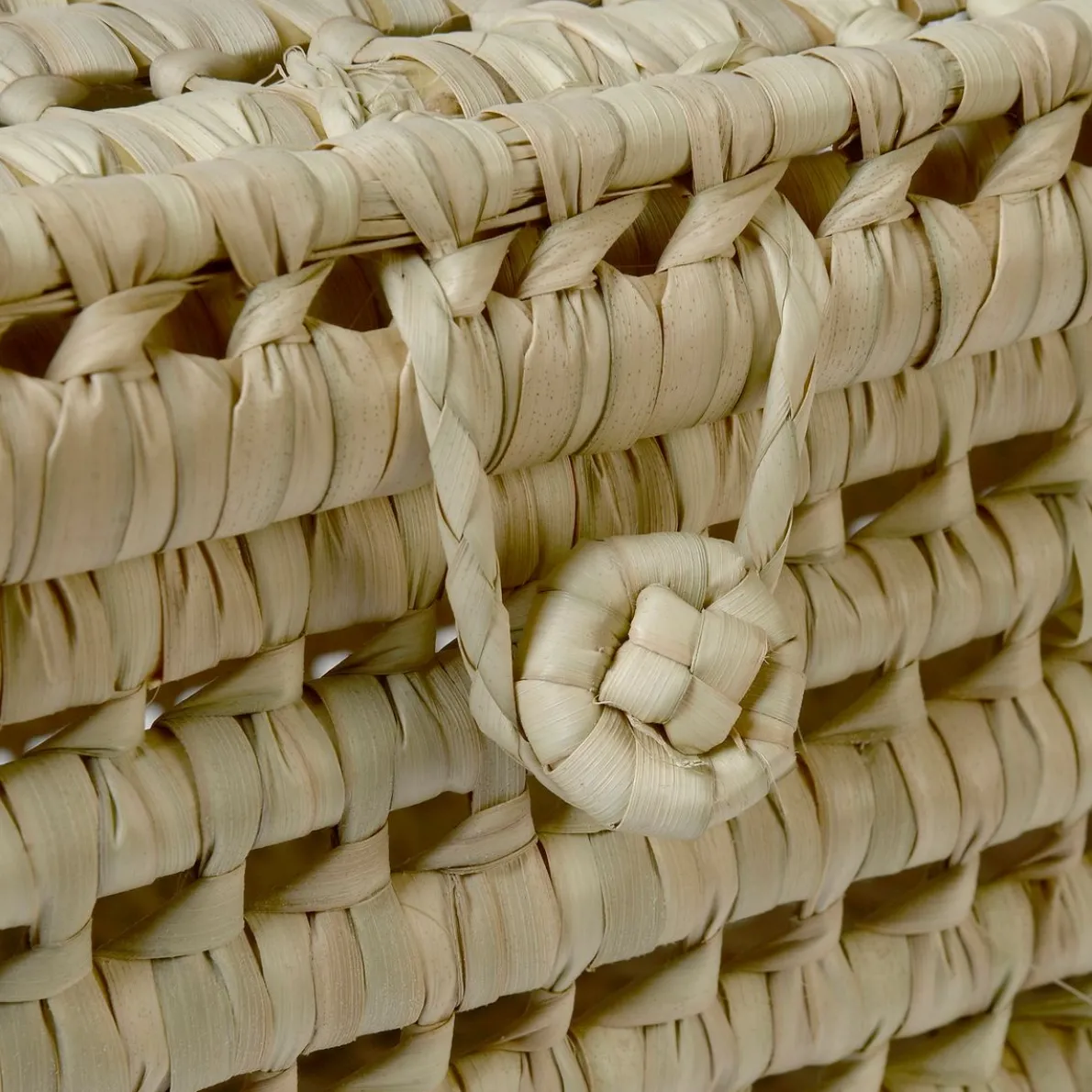 Grote rechthoekige mand met deksel, van open vlechtwerk, met de hand gemaakt van palmblad. Het deksel sluit met 2 lussen en knoppen. Prachtig in je woon- of slaapkamer, voor bijvoorbeeld het opbergen van kussens, dekbedden, speelgoed e.d.