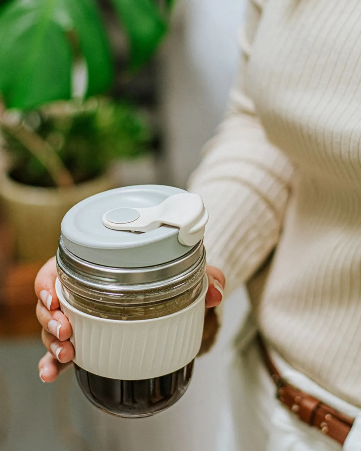 Stevige, hoge, beker van hittebestendig glas, met drinkdop en vasthoudring, voor zowel warme als koude dranken. De beker sluit met een rvs schroefdop met daarin een siliconen klep met drinkopening. De ring is ook van siliconen, daarmee houd je de ring comfortabel vast.