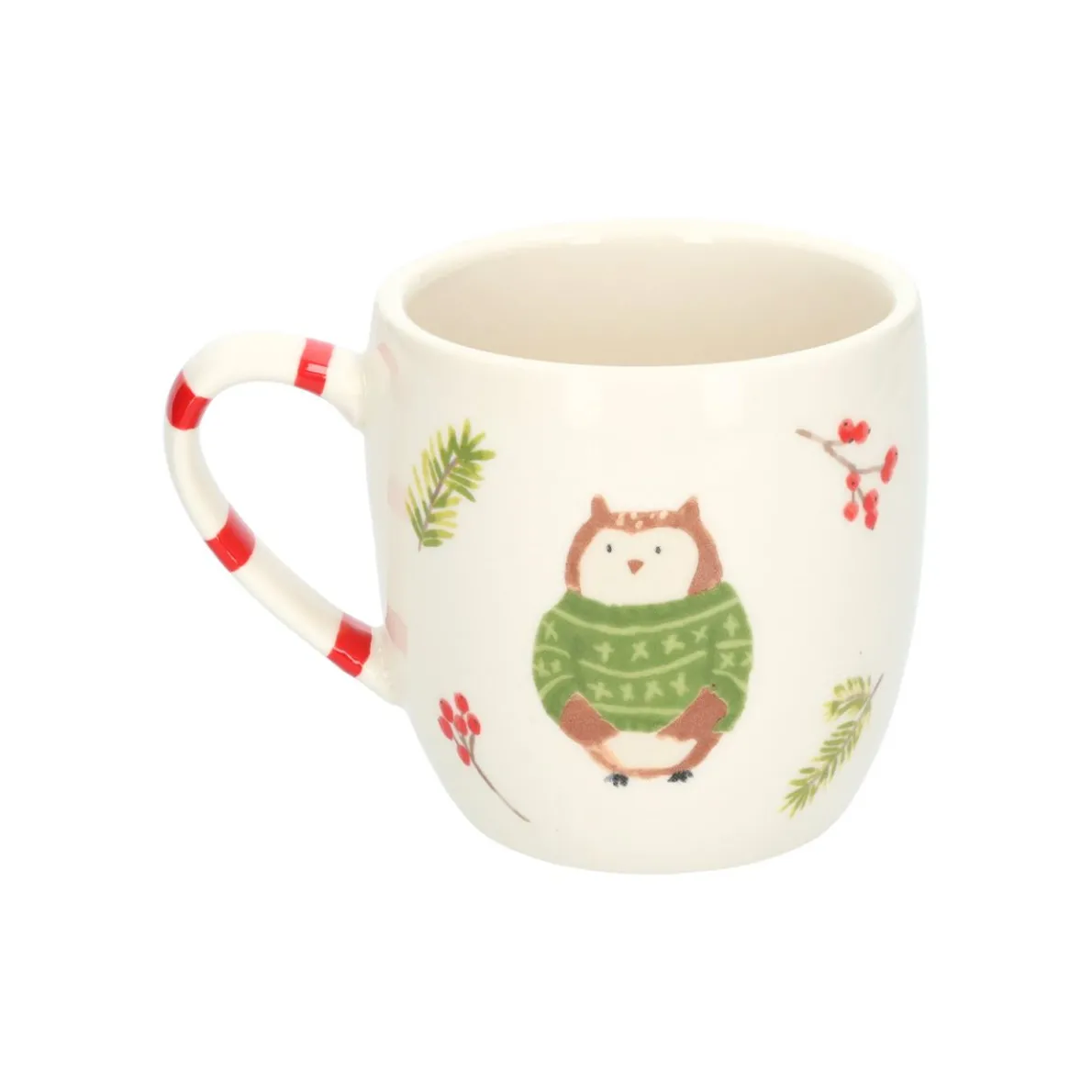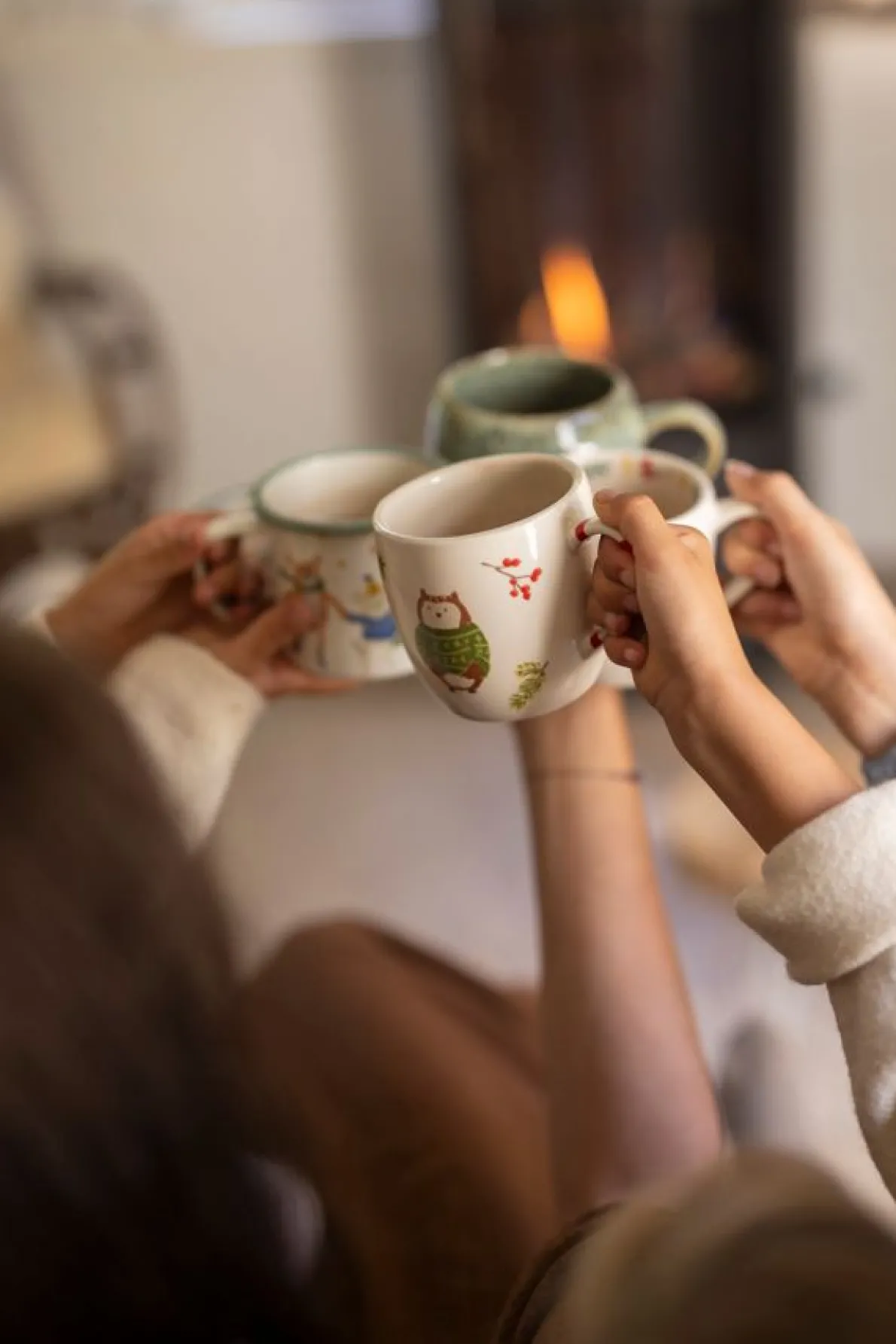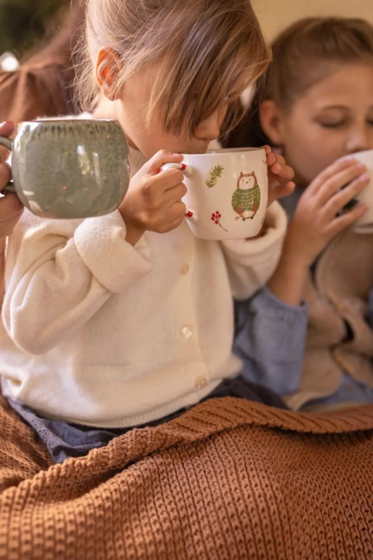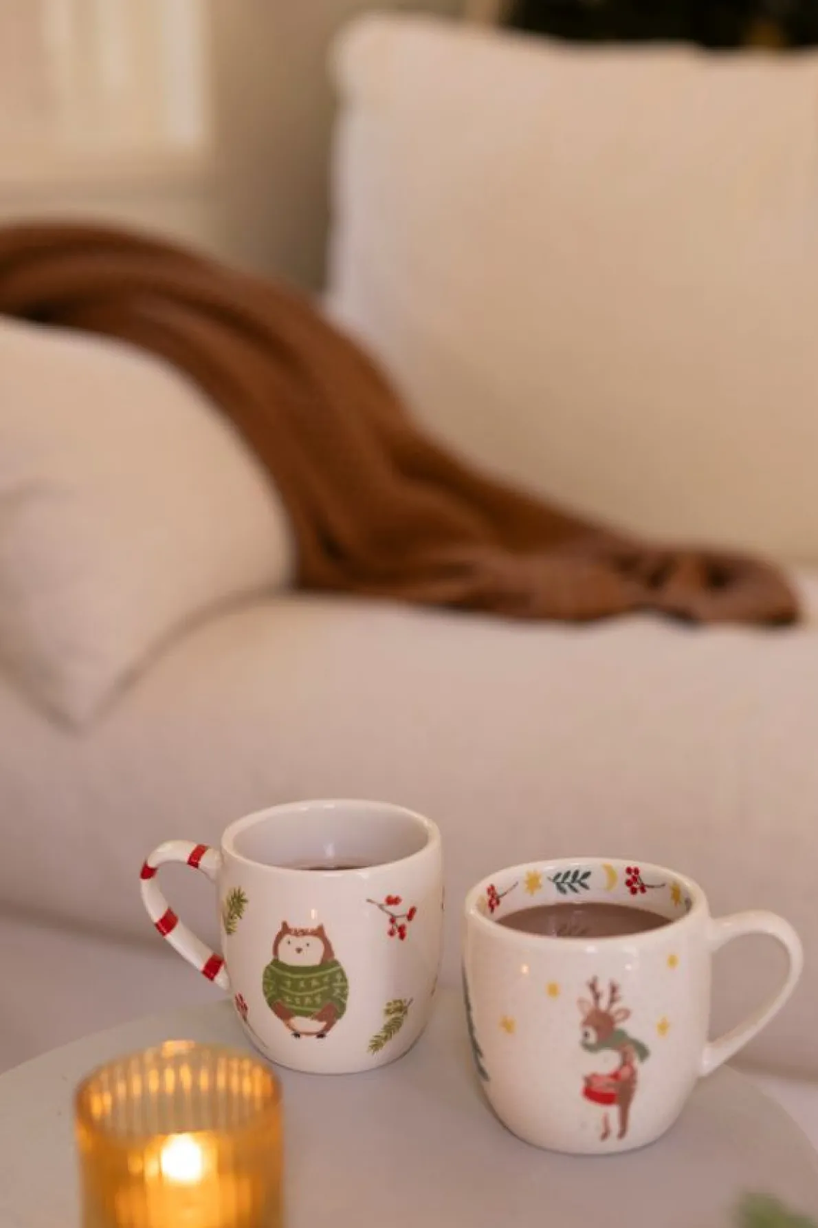 Extra grote mok van offwhite steengoed, speciaal voor kerst bedrukt met knuffelende dieren. Een fijne mok voor thee, warme chocolademelk etc. Steengoed is een extra sterke soort aardewerk. Het dessin is een eigen ontwerp van Dille & Kamille.