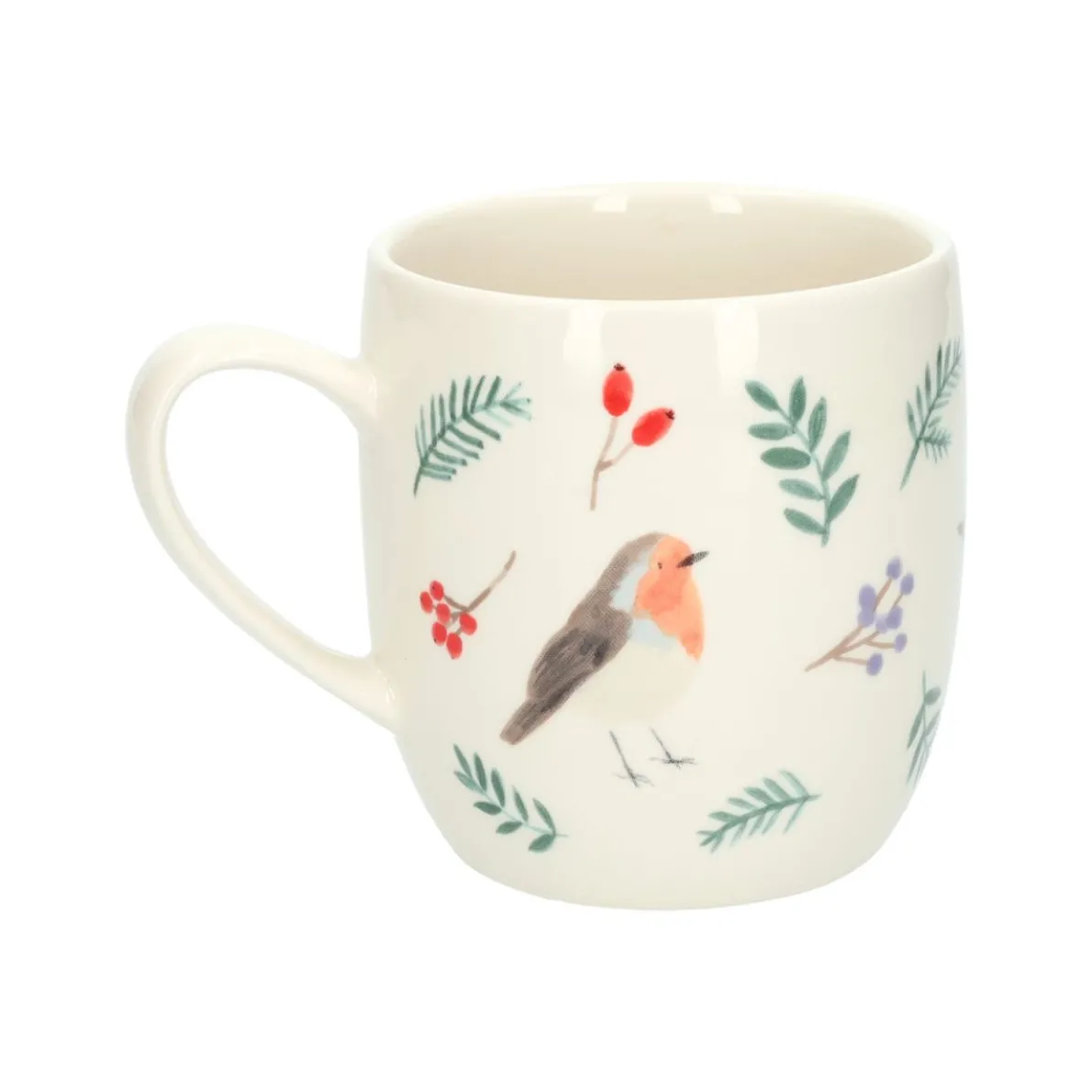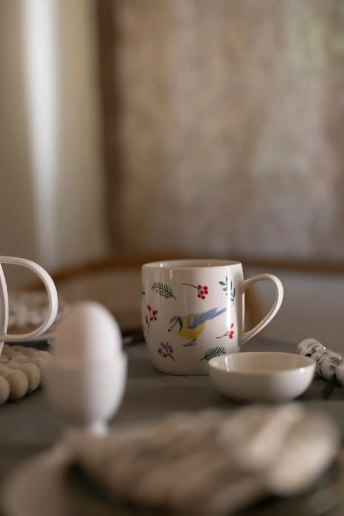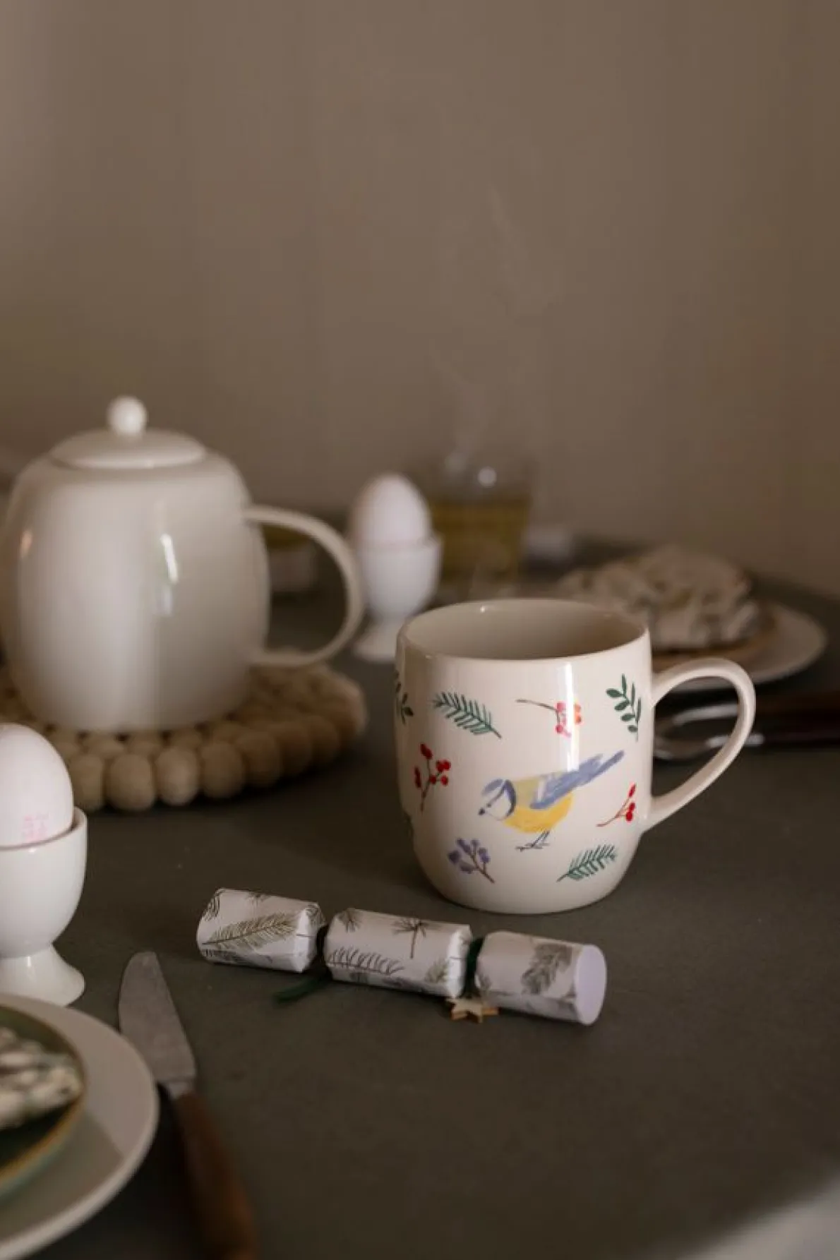Extra grote mok van offwhite steengoed, speciaal voor kerst bedrukt met vogels, besjes en takjes. Een fijne mok voor thee, warme chocolademelk etc. Steengoed is een extra sterke soort aardewerk. Het dessin is een eigen ontwerp van Dille & Kamille.