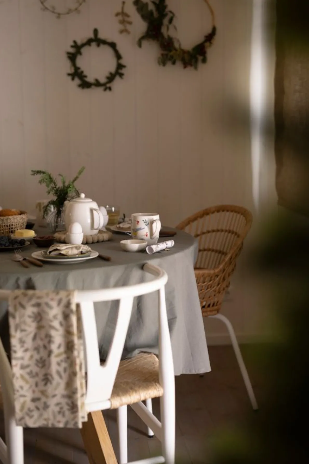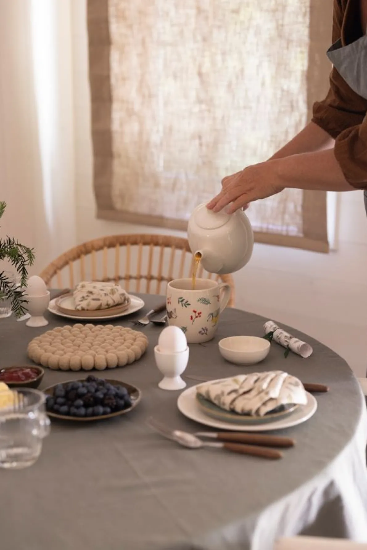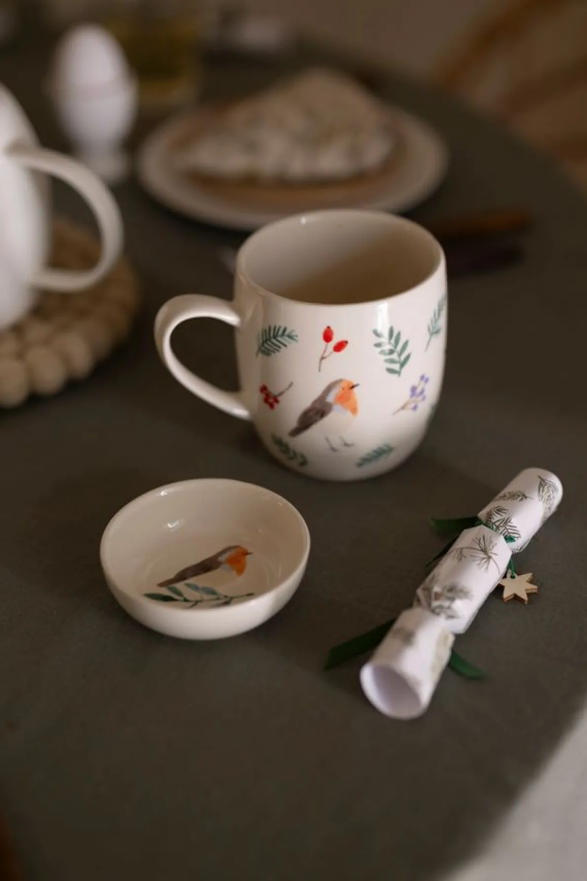 Extra grote mok van offwhite steengoed, speciaal voor kerst bedrukt met vogels, besjes en takjes. Een fijne mok voor thee, warme chocolademelk etc. Steengoed is een extra sterke soort aardewerk. Het dessin is een eigen ontwerp van Dille & Kamille.