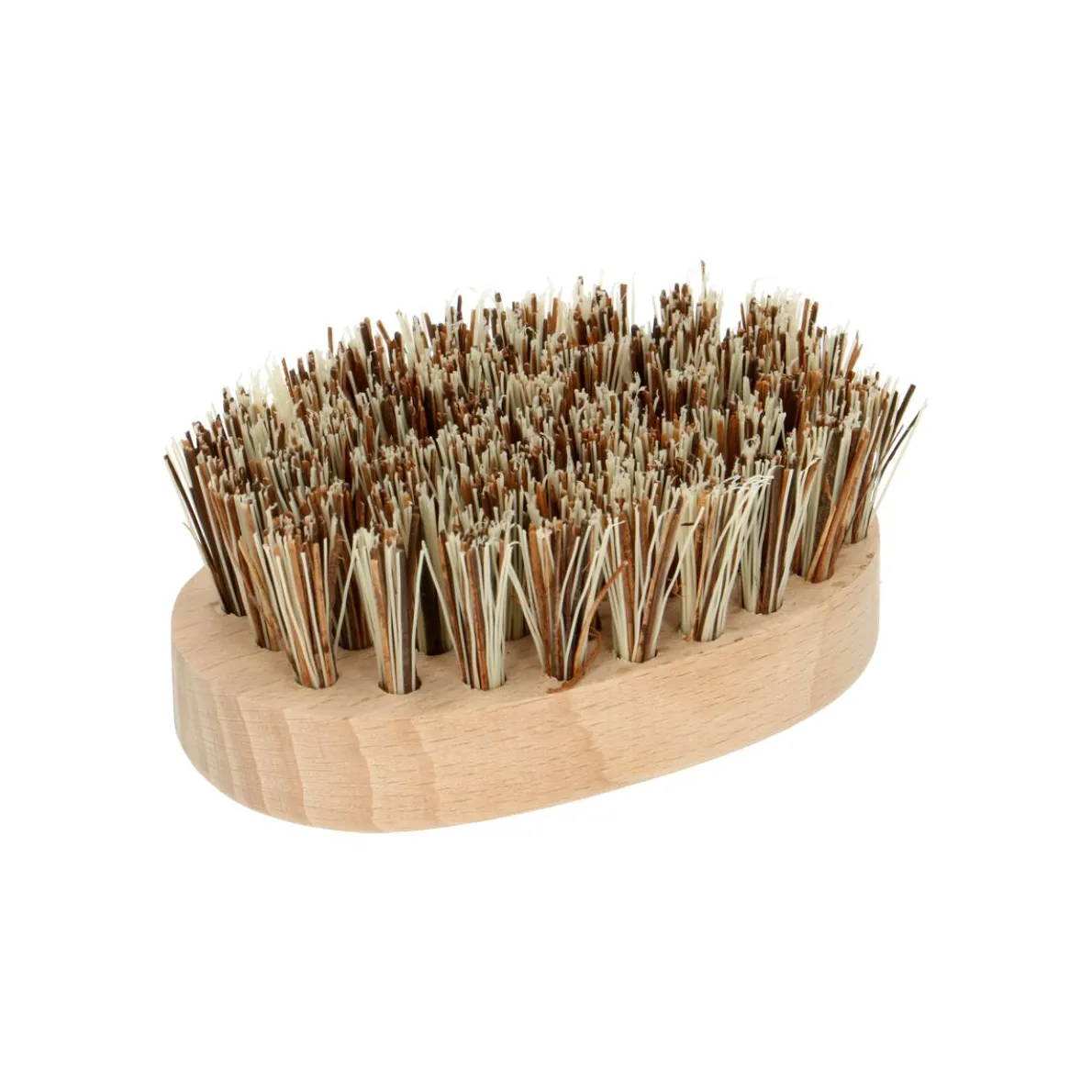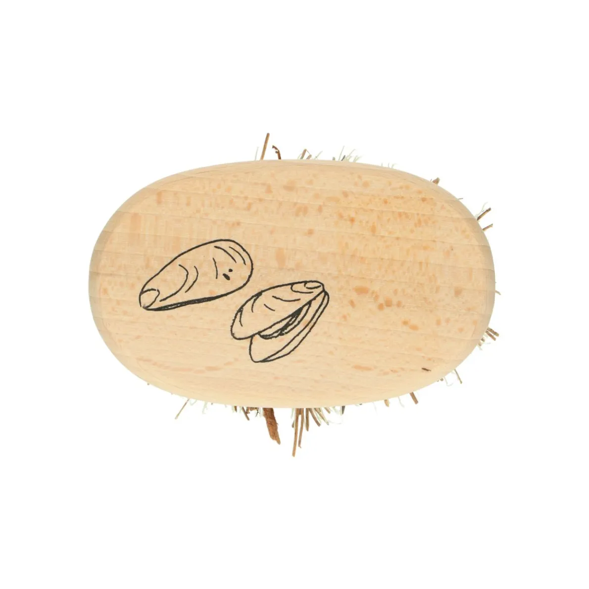 Stevige borstel om mosselen en andere schaal- en schelpdieren schoon te borstelen. Handvat is van beukenhout en de borstelharen zijn een mix van de bladvezel tampico (agave plant) en bassine (sagopalm).