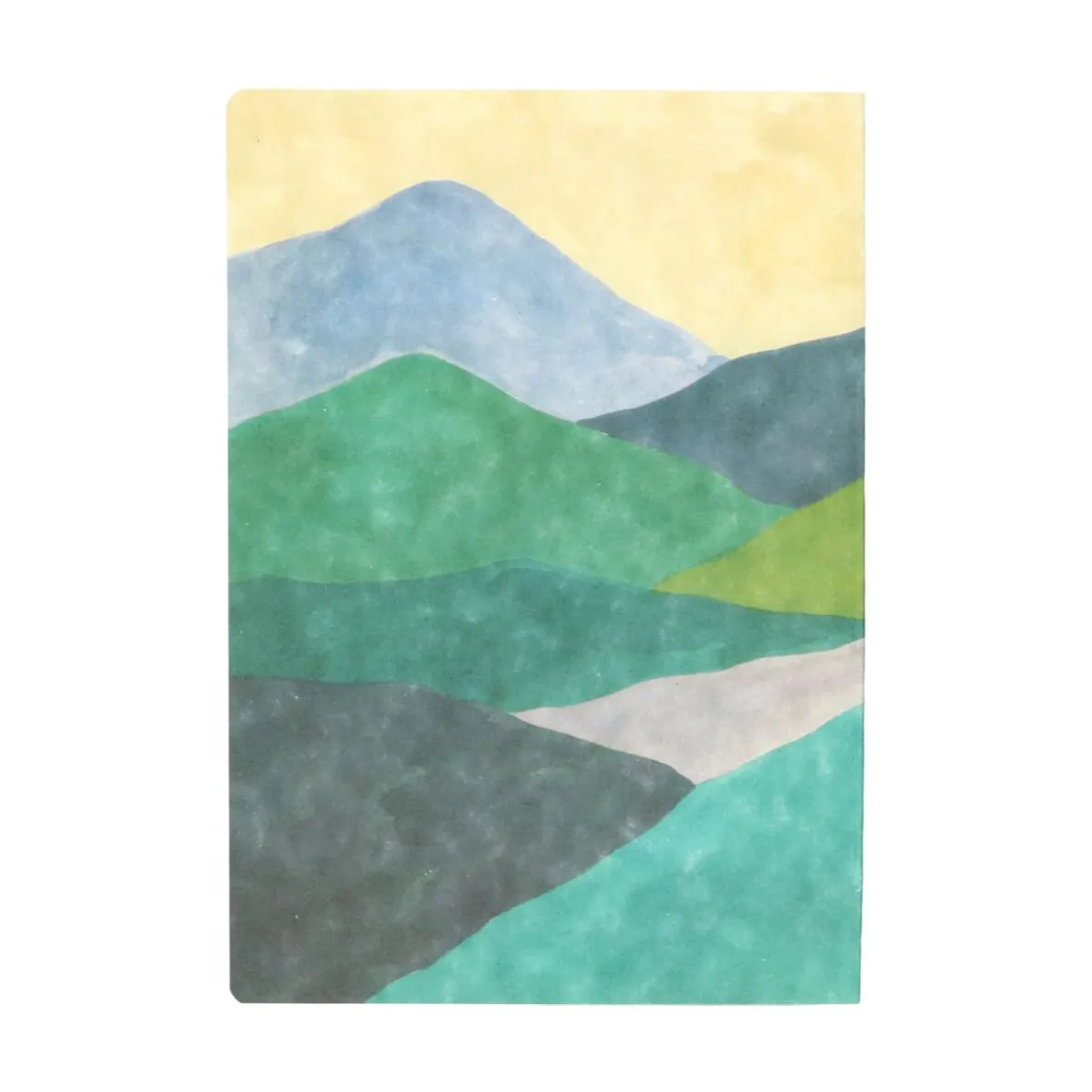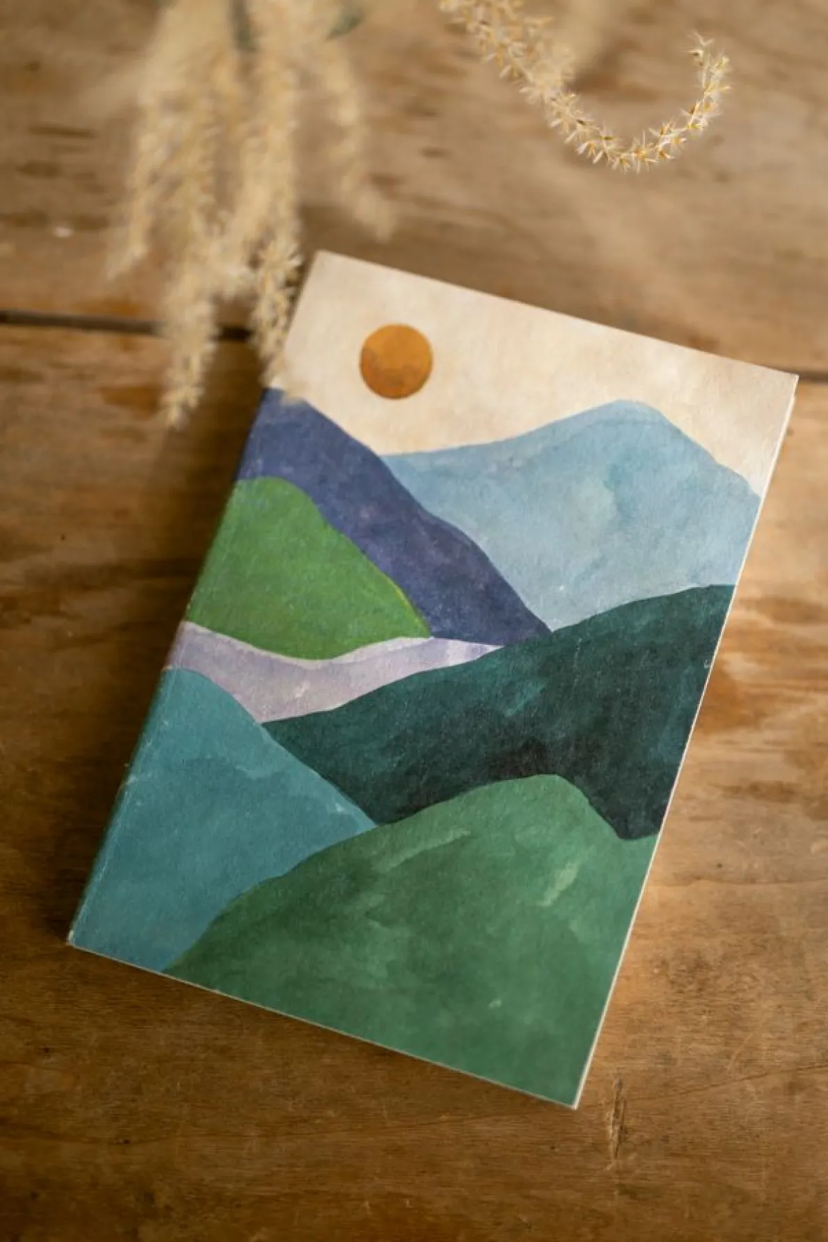 Mooi notitieboek met op de kaft een geschilderd boslandschap. Handig voor op school, thuis of op het werk om aantekeningen, ideeën etc. in te noteren. Het schrift heeft blanco pagina’s.Het papier voor dit schrift is gemaakt van versnipperd katoenafval van de textiel industrie.