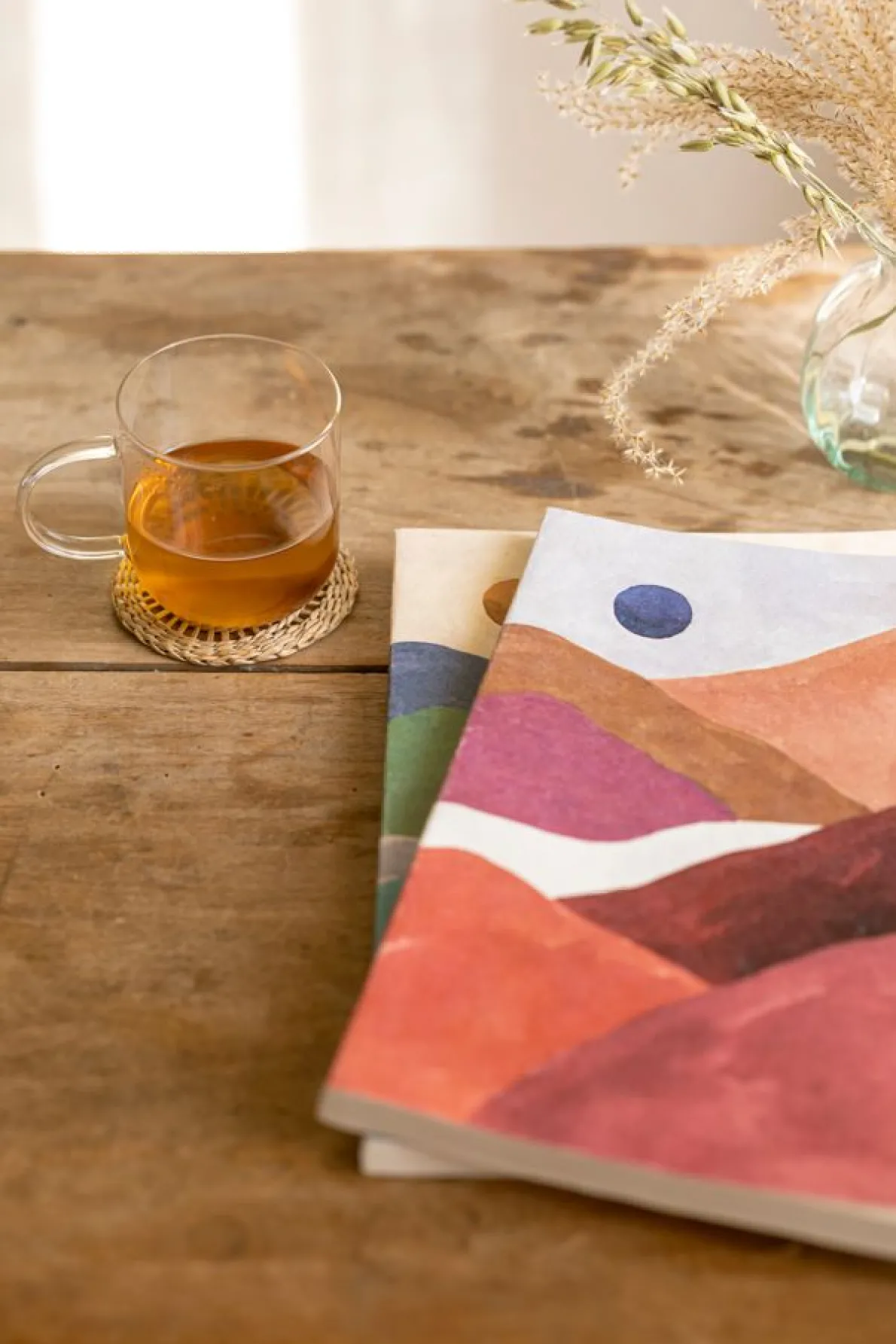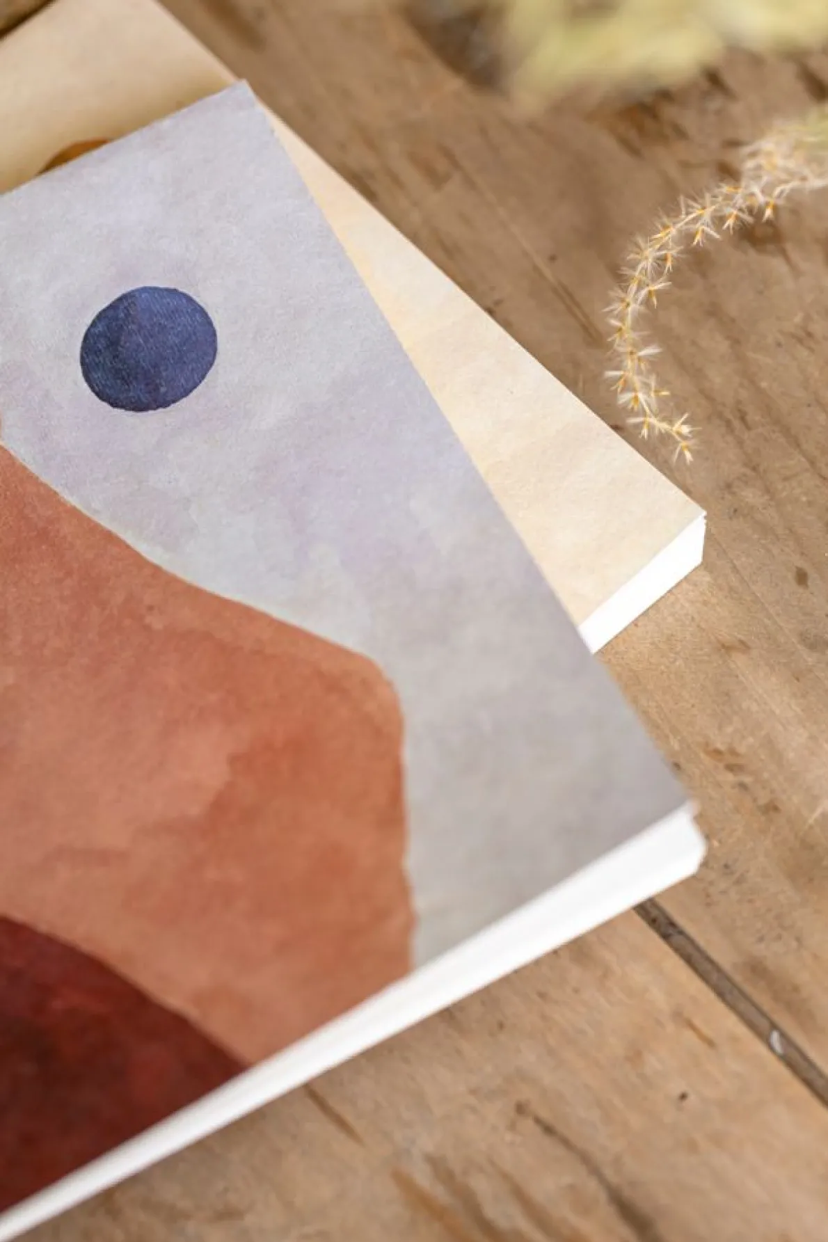 Mooi notitieboek met op de kaft een geschilderd woestijnlandschap. Handig voor op school, thuis of op het werk om aantekeningen, ideeën etc. in te noteren. Het schrift heeft blanco pagina’s.Het papier voor dit schrift is gemaakt van versnipperd katoenafval van de textiel industrie.