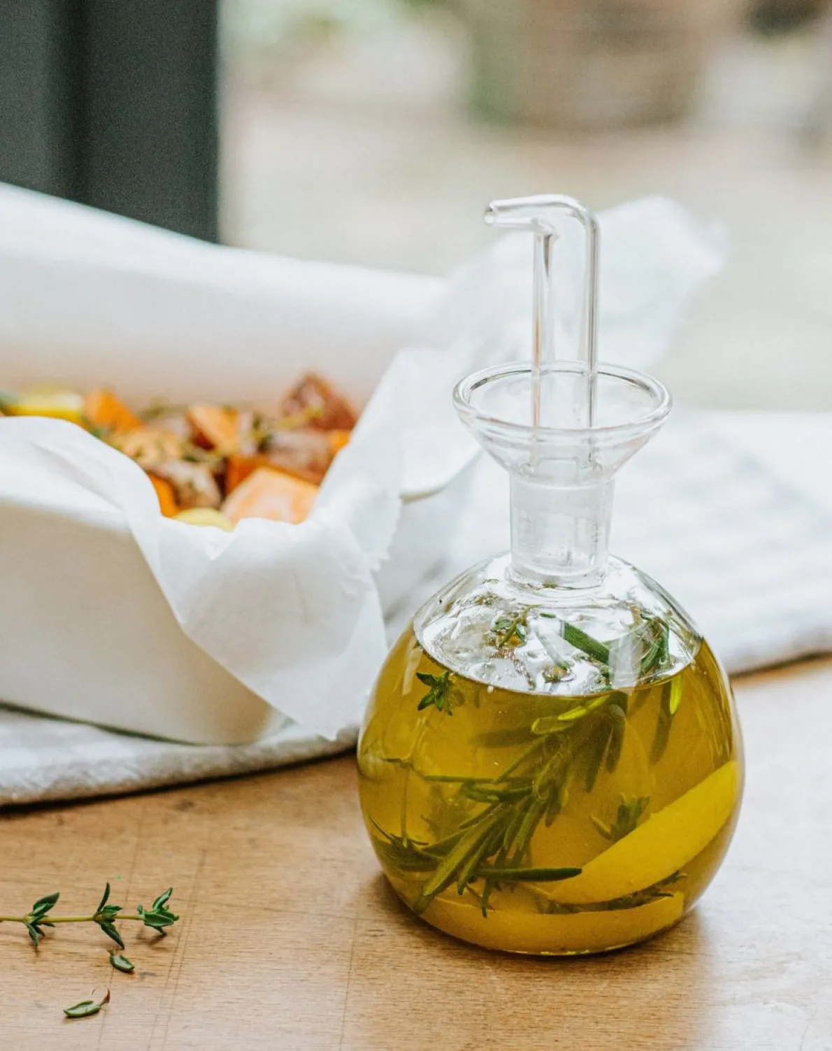 Bolvormig flesje voor (olijf)olie of azijn met een glazen schenktuit. Het flesje is gemaakt van hittebestendig glas, handig bij het afwassen. Mooi om op tafel te zetten met je favoriete olie en/of azijn.