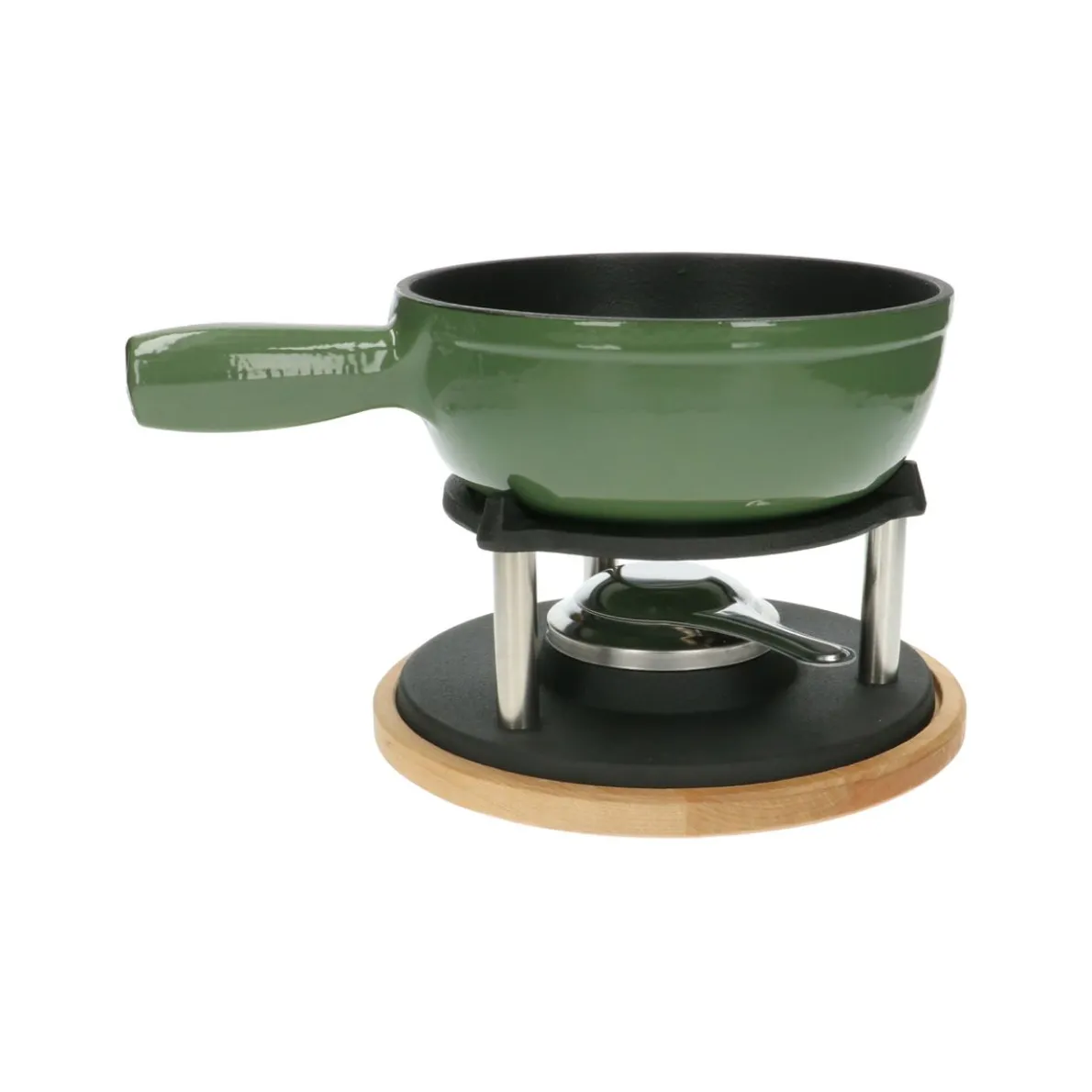 Robuust, gietijzeren onderstel voor onder onze gietijzeren fonduepan, maar ook te gebruiken voor het warm houden van andere pannen, vuurvaste schalen of onze vuurvaste gietijzeren theepot. Het onderstel staat op een houten onderbord dat je ook als snijplank kan gebruiken. Vul de brander met brandgel of brandpasta.
