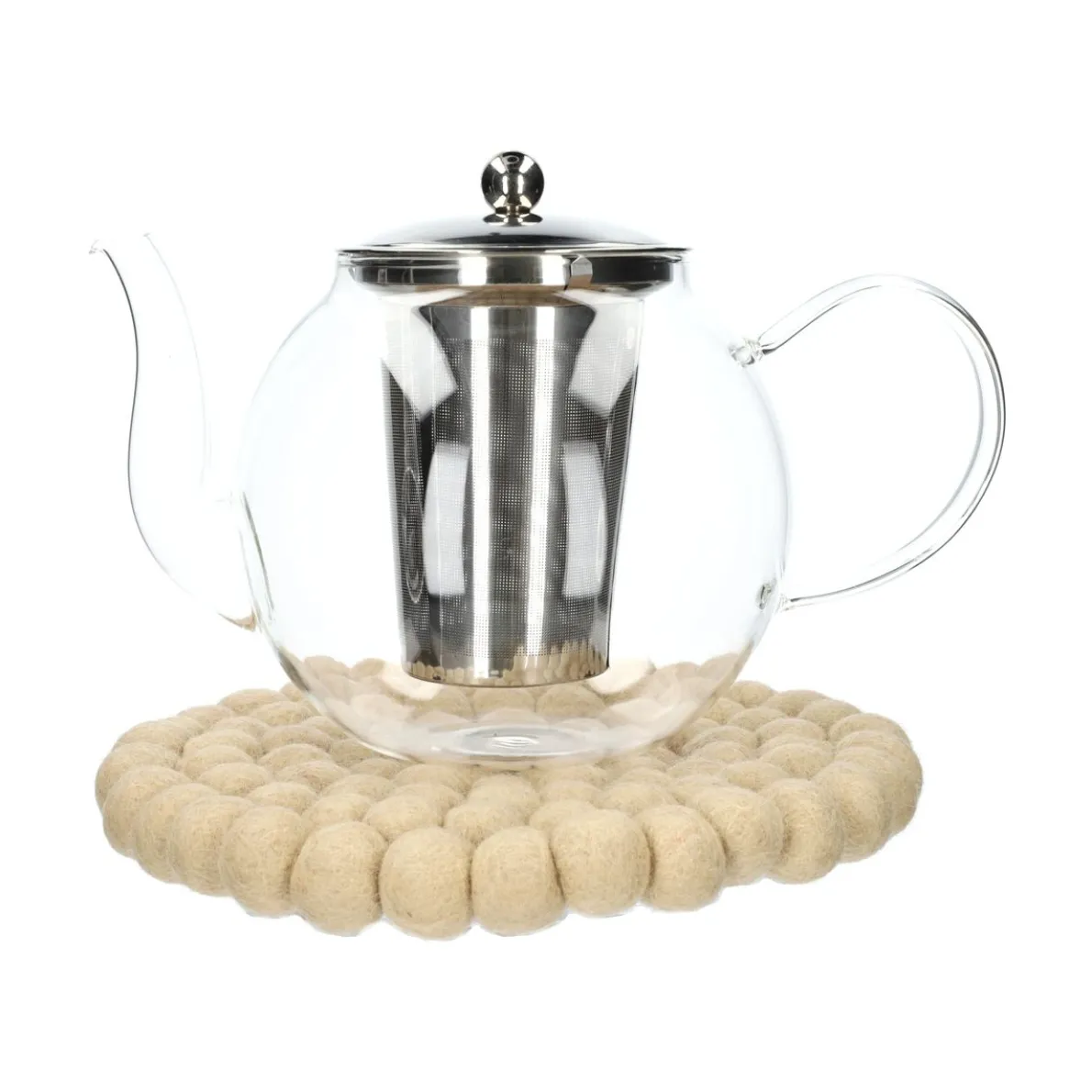 Knusse ronde onderzetter van vilten bolletjes in kiezel tinten. Hiermee bescherm je je je tafel of aanrecht tegen kringen en beschadigingen door een hete pan, ovenschotel of theepot. Omdat dit een handgemaakt product is, kunnen de afmetingen en kleuren van onderzetter tot onderzetter enigszins verschillen. De onderzetter is speciaal ontworpen voor Dille & Kamille en met de hand gemaakt door vrouwen in Nepal, van Nieuw-Zeelandse schapenwol. Onze vaste leverancier van prachtige Fair Trade vilten artikelen helpt hen om hun sociale en economische positie en die van hun gezin te verbeteren. Dit biedt, behalve een vast inkomen, ook een veilige werkplek.
