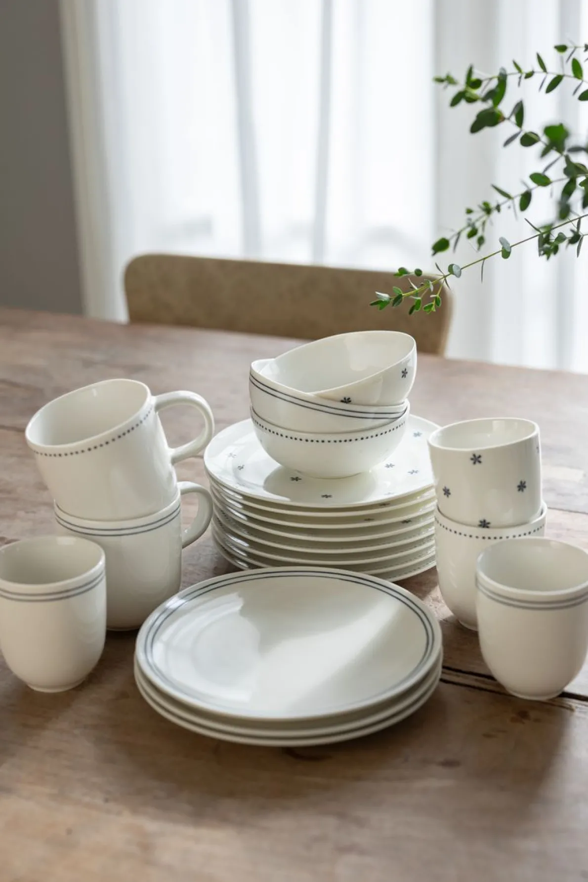 Leuk bord voor je ontbijt, maar ook perfect voor een voor- of nagerecht. Dit bord is onderdeel van een serviesserie bestaande uit een beker, theemok, kommetje en dit ontbijtbord. Een mooi organisch servies van porselein en verkrijgbaar in drie verschillende dessins. De donkerblauwe streepjes zijn een decal. Dit is een speciale folie dat op hoge temperatuur in de oven op het servies wordt gebrand. Het servies kan daardoor in de vaatwasser. De verschillende printjes – ontworpen door Dille & Kamille – passen leuk bij elkaar, maar zijn ook een mooie aanvulling op ons organisch gevormde witte servies.